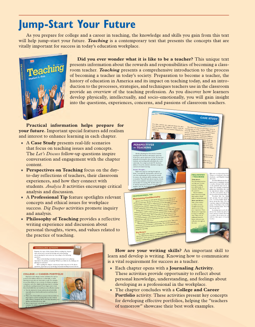 Jump-Start Your Future As you prepare for college and a career in teaching, the knowledge and skills you gain from this text will help jump-start your future. Teaching is a contemporary text that presents the concepts that are vitally important for success in today’s education workplace. Did you ever wonder what it is like to be a teacher? This unique text presents information about the rewards and responsibilities of becoming a class- room teacher. Teaching presents a comprehensive introduction to the process of becoming a teacher in today’s society. Preparation to become a teacher, the history of education in America and its impact on teaching today, and an intro- duction to the processes, strategies, and techniques teachers use in the classroom provide an overview of the teaching profession. As you discover how learners develop physically, intellectually, and socio-emotionally, you will gain insight into the questions, experiences, concerns, and passions of classroom teachers. How are your writing skills? An important skill to learn and develop is writing. Knowing how to communicate is a vital requirement for success as a teacher. ■ Each chapter opens with a Journaling Activity. These activities provide opportunity to reflect about personal knowledge, understanding, and feelings about developing as a professional in the workplace. ■ The chapter concludes with a College and Career Portfolio activity. These activities present key concepts for developing effective portfolios, helping the “teachers of tomorrow” showcase their best work examples. H ave you ever wondered how schools came to be the way are today? Who decided which subjects should be taught? Whthey textbooks originate? Has h In th Ben shares his interest in pursuing a career in teaching with one of the residents, William, who is in his 90s. William was a teacher, school principal, and also served as a district superintendent during his working years. Cognitively, William is well and the conversation between him and Ben is lively and rich. Stories about his of being a student, own students, colleagues, and community experiences abound. gleaned a wealth of information and looked forward to continuing his relationship with William in the future. Let’s Discuss ■ Predict what William might have shared about the influences on the state of education in his youth. ■ What might William have shared about the influences on the state of education during his early career? As a class, read the case study and discuss the ques- tions that follow. After reading the chapter, revisit the discussion Have your answers changed? If so, explain how.questions. Ben’s class is visiting an assisted-living home for elderly residents as a part of his high school history class. He and his classmates are supposed to engage the residents in conversation as a way of practicing oral-history data collection. CASE STUDY d f hfunctioning m cmemories B fBen i L Fuse/Getty Images d Ben is lively and rich. Storie memories of being a student, hhis is ow perienc ation onship hav e s f educ red ab cation ely an d rich. S memories of being a student, h p a o h f r c Aneka is finishing her first week of student teaching in Mr. Sanchez’s third grade classroom. It has been a great experience so far. She has been primarily observing the class, getting to know the students, and working with individuals who need extra help. She is impressed with Mr. Sanchez’s ability to focus the students’ abundant energy into excitement toward learning. Aneka’s Thoughts… Right now, ideas are swirling through my brain. I met with Mr. Sanchez after school to go over the teaching plan for the next two weeks. In science, the students will be starting a new unit on weather. They will learn about seasons, clouds, forms of precipitation, tornadoes and hurricanes, and weather forecasting. Mr. Sanchez asked me to develop and teach a lesson to introduce the weather unit. He challenged me to get the students enthused about the of weather so they Sidekick/E+/Getty Images PERSPECTIVES on TEACHING weather unit. He challenged me to ge enthused about the sstudy ged me to ge used about the C Inc Chapter 1 The Teaching Profession they are often think g skills takes additional time. Most teachers attend w and many take classes toward a more advanced degree. PROFESSIONAL TIP Maintaining Confidentialityyou Did you ever receive an exam grade that were less than proud of? Most people have. Grades are personal. If there is a breakdown in confidentiality, it often leads to embarrassment and disengagement in the learning process. Likewise, events that happen on school grounds must remain confidential unless safety issues surround the events. Being a part of a school community, whether as a teacher or as a student helper, requires cautious and thoughtful behavior. This also includes actions in regard to record keeping and communication. It takes vigilance to maintain confidentiality. This is especially true about school events, and student behavior, achievements, and personal data. Teachers and administrative staff must use discernment, trust, and clear communication in regard to confidential issues.protects Maintaining confidentiality students from harm. Take note of how your school maintains confidentiality. This includes informal communication between teachers and students, school behavioral issues, and grade reporting. Dig Deeperonline Use reliable resources to further investigate confidentiality in schools. What factors influence confidentiality policies for schools? What information can be shared and what information cannot? How can you practice confidentiality in your daily life as you contemplate a teaching career? PHILOSOPHY of TEACHING Think about… The following question can help you on your journey to writing your philosophy of education. Reflect on the question. How do students learn? How do you think that teachers should address learning diversity? Write and discuss… Take