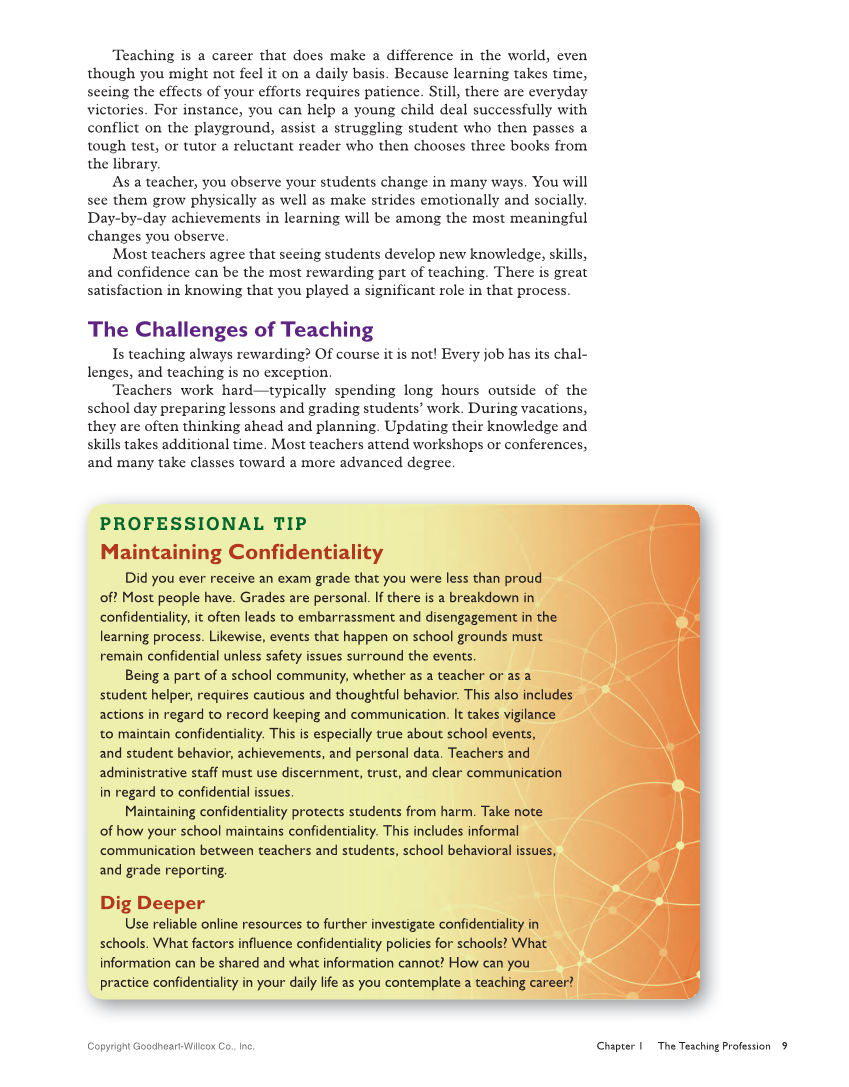 Copyright Goodheart-Willcox Co., Inc. Chapter 1 The Teaching Profession 9 Teaching is a career that does make a difference in the world, even though you might not feel it on a daily basis. Because learning takes time, seeing the effects of your efforts requires patience. Still, there are everyday victories. For instance, you can help a young child deal successfully with conflict on the playground, assist a struggling student who then passes a tough test, or tutor a reluctant reader who then chooses three books from the library. As a teacher, you observe your students change in many ways. You will see them grow physically as well as make strides emotionally and socially. Day-by-day achievements in learning will be among the most meaningful changes you observe. Most teachers agree that seeing students develop new knowledge, skills, and confidence can be the most rewarding part of teaching. There is great satisfaction in knowing that you played a significant role in that process. The Challenges of Teaching Is teaching always rewarding? Of course it is not! Every job has its chal- lenges, and teaching is no exception. Teachers work hard—typically spending long hours outside of the school day preparing lessons and grading students’ work. During vacations, they are often thinking ahead and planning. Updating their knowledge and skills takes additional time. Most teachers attend workshops or conferences, and many take classes toward a more advanced degree. PROFESSIONAL TIP Maintaining Confidentiality Did you ever receive an exam grade that you were less than proud of? Most people have. Grades are personal. If there is a breakdown in confidentiality, it often leads to embarrassment and disengagement in the learning process. Likewise, events that happen on school grounds must remain confidential unless safety issues surround the events. Being a part of a school community, whether as a teacher or as a student helper, requires cautious and thoughtful behavior. This also includes actions in regard to record keeping and communication. It takes vigilance to maintain confidentiality. This is especially true about school events, and student behavior, achievements, and personal data. Teachers and administrative staff must use discernment, trust, and clear communication in regard to confidential issues. Maintaining confidentiality protects students from harm. Take note of how your school maintains confidentiality. This includes informal communication between teachers and students, school behavioral issues, and grade reporting. Dig Deeper Use reliable online resources to further investigate confidentiality in schools. What factors influence confidentiality policies for schools? What information can be shared and what information cannot? How can you practice confidentiality in your daily life as you contemplate a teaching career?