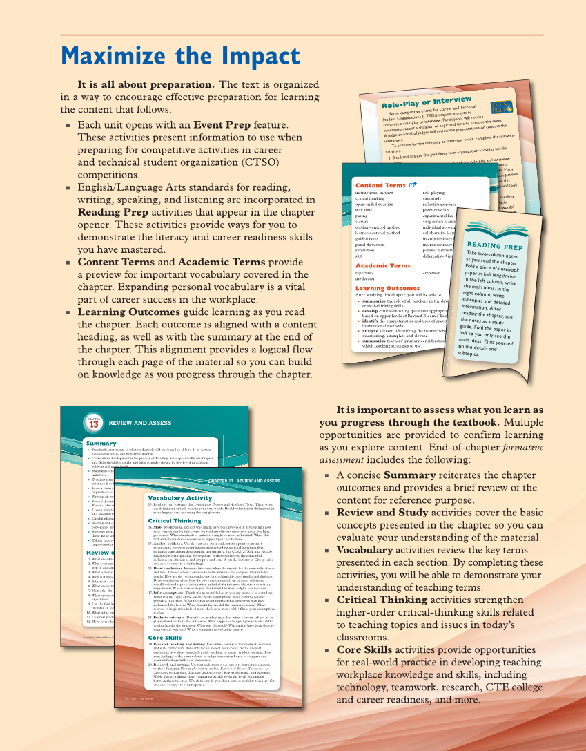 It is important to assess what you learn as you progress through the textbook. Multiple opportunities are provided to confirm learning as you explore content. End-of-chapter formative assessment includes the following: ■ A concise Summary reiterates the chapter outcomes and provides a brief review of the content for reference purpose. ■ Review and Study activities cover the basic concepts presented in the chapter so you can evaluate your understanding of the material. ■ Vocabulary activities review the key terms presented in each section. By completing these activities, you will be able to demonstrate your understanding of teaching terms. ■ Critical Thinking activities strengthen higher-order critical-thinking skills related to teaching topics and issues in today’s classrooms. ■ Core Skills activities provide opportunities for real-world practice in developing teaching workplace knowledge and skills, including technology, teamwork, research, CTE college and career readiness, and more. Maximize the Impact It is all about preparation. The text is organized in a way to encourage effective preparation for learning the content that follows. ■ Each unit opens with an Event Prep feature. These activities present information to use when preparing for competitive activities in career and technical student organization (CTSO) competitions. ■ English/Language Arts standards for reading, writing, speaking, and listening are incorporated in Reading Prep activities that appear in the chapter opener. These activities provide ways for you to demonstrate the literacy and career readiness skills you have mastered. ■ Content Terms and Academic Terms provide a preview for important vocabulary covered in the chapter. Expanding personal vocabulary is a vital part of career success in the workplace. ■ Learning Outcomes guide learning as you read the chapter. Each outcome is aligned with a content heading, as well as with the summary at the end of the chapter. This alignment provides a logical flow through each page of the material so you can build on knowledge as you progress through the chapter. Role-Play or Interview Some competitive events for Career and Technical Student Organizations (CTSOs) require entrants to complete a role-play or interview. Participants will receive information about a situation or topic and time to practice the event. A judge or panel of judges will review the presentations or conduct the interviews. To prepare for the role-play or interview event, complete the following activities. 1. Read and analyze the guidelines your organization provides for this event. 2. Visit the organization’s website and look for role-play and interview events from previous years. Many organizations post these events for students to use in practicing for future competitions. (Noter: Many organizations post online videos of top performers in their events.) In addition, locate the evaluation criteria or rubric event. Such information helps you determine what the judges will for in your presentation. 3. Practice speaking in front of a mirror. Are you comfortable without directly reading your notes? Do your eye contact, facial expressions, and gestures convey the same message as your words? 4. Ask a friend to practice role-play or interview with you as your instructor takes the role of judge. Give special attention your posture and how you present yourself. Concentrate on your tone of voice—it should be pleasant and loud enough to hear without shouting. Make eye contact with the listener to engage the person’s tive feedback event d look for role-play an event ote : M fo es e faciaspeakingrds?o event b i nd look for rolp y ev o fcompetitivetthislookwspeforccompe e Content Terms instructional method critical thinking open-ended question wait time pacing closure teacher-centered methodto learner-centered method guided notes panel discussion simulation skit role-playing case study reflective response productive lab experimental lab cooperative learning individual accountability collaborative learning interdisciplinary learning interdisciplinary understanding parallel instructional designngid differentiated instructional method Academic Terms repertoire moderator empowerod Learning Outcomes After studying this chapter, you will be able to ■ summarize the role of all teachers in the development of critical-thinking skills. ■ develop critical-thinking questions appropriate for instruction based on upper levels of Revised Bloom’s Taxonomy. ■ identify the characteristics and uses of specific types of instructional methods. ■ analyze a lesson, identifying the instructional methods and use of questioning, examples, and closure. ■ summarize teachers’ primary considerations when deciding which teaching strategies to use. as your te ntion te nti ur wo you a al att al att e lab nyourcompetition tal la b ve learning l accountabilit y ive learnin g plinary learnin g plinary understanding structional es ated instructionTake al m ethod development o f priate for instruction T axonom y. e cific t yp es o f onal methods and use of ons when decidin g u y a a READING PREPyourfrom two-column notes as you read the chapter. Fold a piece of notebook paper in half lengthwise. In the left column, write the main ideas. In the right column, write subtopics and detailed information. After reading the chapter, use the notes as a study guide. Fold the paper in half so you only see the main ideas. Quiz yourself on the details and subtopics. Copyright Goodheart-Willcox Co., Inc.. Chapter 13 Planning for 305 Copyright Goodheart-Willcox Co., Inc. Summary ■ Standards, statements of what students should know and be able to do at certain educational levels, can be very influential. ■ Curriculum development is the process of deciding, more specifically, what topics and skills should be taught and what attitudes should be developed in different subjects and grade levels. ■ Standards often influence curricu