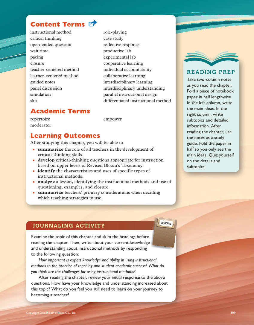 Copyright Goodheart-Willcox Co., Inc. 309 Content Terms instructional method critical thinking open-ended question wait time pacing closure teacher-centered method learner-centered method guided notes panel discussion simulation skit role-playing case study reflective response productive lab experimental lab cooperative learning individual accountability collaborative learning interdisciplinary learning interdisciplinary understanding parallel instructional design differentiated instructional method Academic Terms repertoire moderator empower Learning Outcomes After studying this chapter, you will be able to ■ summarize the role of all teachers in the development of critical-thinking skills. ■ develop critical-thinking questions appropriate for instruction based on upper levels of Revised Bloom’s Taxonomy. ■ identify the characteristics and uses of specific types of instructional methods. ■ analyze a lesson, identifying the instructional methods and use of questioning, examples, and closure. ■ summarize teachers’ primary considerations when deciding which teaching strategies to use. READING PREP Take two-column notes as you read the chapter. Fold a piece of notebook paper in half lengthwise. In the left column, write the main ideas. In the right column, write subtopics and detailed information. After reading the chapter, use the notes as a study guide. Fold the paper in half so you only see the main ideas. Quiz yourself on the details and subtopics. Examine the topic of this chapter and skim the headings before reading the chapter. Then, write about your current knowledge and understanding about instructional methods by responding to the following question: How important is expert knowledge and ability in using instructional methods to the practice of teaching and student academic success? What do you think are the challenges for using instructional methods? After reading the chapter, review your initial response to the above questions. How have your knowledge and understanding increased about this topic? What do you feel you still need to learn on your journey to becoming a teacher? JOURNALING ACTIVITY JOURNAL