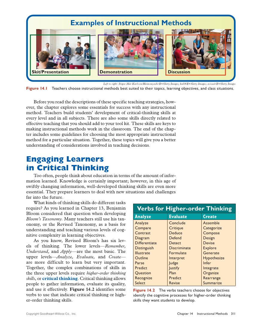 Copyright Goodheart-Willcox Co., Inc. Chapter 14 Instructional Methods 311 Before you read the descriptions of these specific teaching strategies, how- ever, the chapter explores some essentials for success with any instructional method. Teachers build students’ development of critical-thinking skills at every level and in all subjects. There are also some skills directly related to effective teaching that you should add to your tool kit. These skills are keys to making instructional methods work in the classroom. The end of the chap- ter includes some guidelines for choosing the most appropriate instructional method for a particular situation. Together, these topics will give you a better understanding of considerations involved in teaching decisions. Engaging Learners in Critical Thinking Too often, people think about education in terms of the amount of infor- mation learned. Knowledge is certainly important however, in this age of swiftly changing information, well-developed thinking skills are even more essential. They prepare learners to deal with new situations and challenges far into the future. What kinds of thinking skills do different tasks require? As you learned in Chapter 13, Benjamin Bloom considered that question when developing Bloom’s Taxonomy. Many teachers still use his tax- onomy, or the Revised Taxonomy, as a basis for understanding and teaching various levels of cog- nitive complexity in learning objectives. As you know, Revised Bloom’s has six lev- els of thinking. The lower levels—Remember, Understand, and Apply—are the most basic. The upper levels—Analyze, Evaluate, and Create— are more difficult to learn but very important. Together, the complex combinations of skills in the three upper levels require higher-order thinking skills, or critical thinking. Critical thinking allows people to gather information, evaluate its quality, and use it effectively. Figure 14.2 identifies some verbs to use that indicate critical thinking or high- er-order thinking skills. Demonstration Skit/Presentation Discussion Examples of Instructional Methods Left to right: Stigur Már Karlsson/Heimsmyndir/E+/Getty Images kali9/E+/Getty Images asiseeit/E+/Getty Images Figure 14.1 Teachers choose instructional methods best suited to their topics, learning objectives, and class situations. Verbs for Higher-order Thinking Analyze Evaluate Create Analyze Compare Contrast Diagram Differentiate Distinguish Illustrate Outline Parse Predict Question Recognize Select Conclude Critique Deduce Defend Detect Discriminate Formulate Interpret Judge Justify Plan Predict Revise Assemble Categorize Compose Design Devise Explore Generate Hypothesize Infer Integrate Organize Rearrange Summarize Figure 14.2 The verbs teachers choose for objectives identify the cognitive processes for higher-order thinking skills they want students to develop.