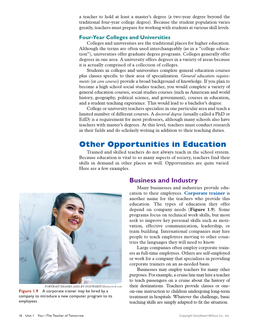Copyright Goodheart-Willcox Co., Inc. 16 Unit 1 You—The Teacher of Tomorrow a teacher to hold at least a master’s degree (a two-year degree beyond the traditional four-year college degree). Because the student population varies greatly, teachers must prepare for working with students at various skill levels. Four-Year Colleges and Universities Colleges and universities are the traditional places for higher education. Although the terms are often used interchangeably (as in a “college educa- tion”), universities offer graduate degree programs. Colleges generally offer degrees in one area. A university offers degrees in a variety of areas because it is actually comprised of a collection of colleges. Students in colleges and universities complete general education courses plus classes specific to their area of specialization. General education require- ments (or core courses) provide a broad background of knowledge. If you plan to become a high school social studies teacher, you would complete a variety of general education courses, social studies courses (such as American and world history, geography, political science, and government), courses in education, and a student teaching experience. This would lead to a bachelor’s degree. College or university teachers specialize in one particular area and teach a limited number of different courses. A doctoral degree (usually called a PhD or EdD) is a requirement for most professors, although many schools also have teachers with master’s degrees. At this level, teachers must conduct research in their fields and do scholarly writing in addition to their teaching duties. Other Opportunities in Education Trained and skilled teachers do not always teach in the school system. Because education is vital to so many aspects of society, teachers find their skills in demand in other places as well. Opportunities are quite varied. Here are a few examples. Business and Industry Many businesses and industries provide edu- cation to their employees. Corporate trainer is another name for the teachers who provide this education. The types of education they offer depend on company needs (Figure 1.9). Some programs focus on technical work skills, but most seek to improve key personal skills such as moti- vation, effective communication, leadership, or team building. International companies may hire people to teach employees moving to other coun- tries the languages they will need to know. Large companies often employ corporate train- ers as full-time employees. Others are self-employed or work for a company that specializes in providing corporate trainers on an as-needed basis. Businesses may employ teachers for many other purposes. For example, a cruise line may hire a teacher to teach passengers on a cruise about the history of their destinations. Teachers provide classes or one- on-one instruction to children undergoing long-term treatment in hospitals. Whatever the challenge, basic teaching skills are simply adapted to fit the situation. PORTRAIT IMAGES ASIA BY NONWARIT/Shutterstock.com Figure 1.9 A corporate trainer may be hired by a company to introduce a new computer program to its employees.