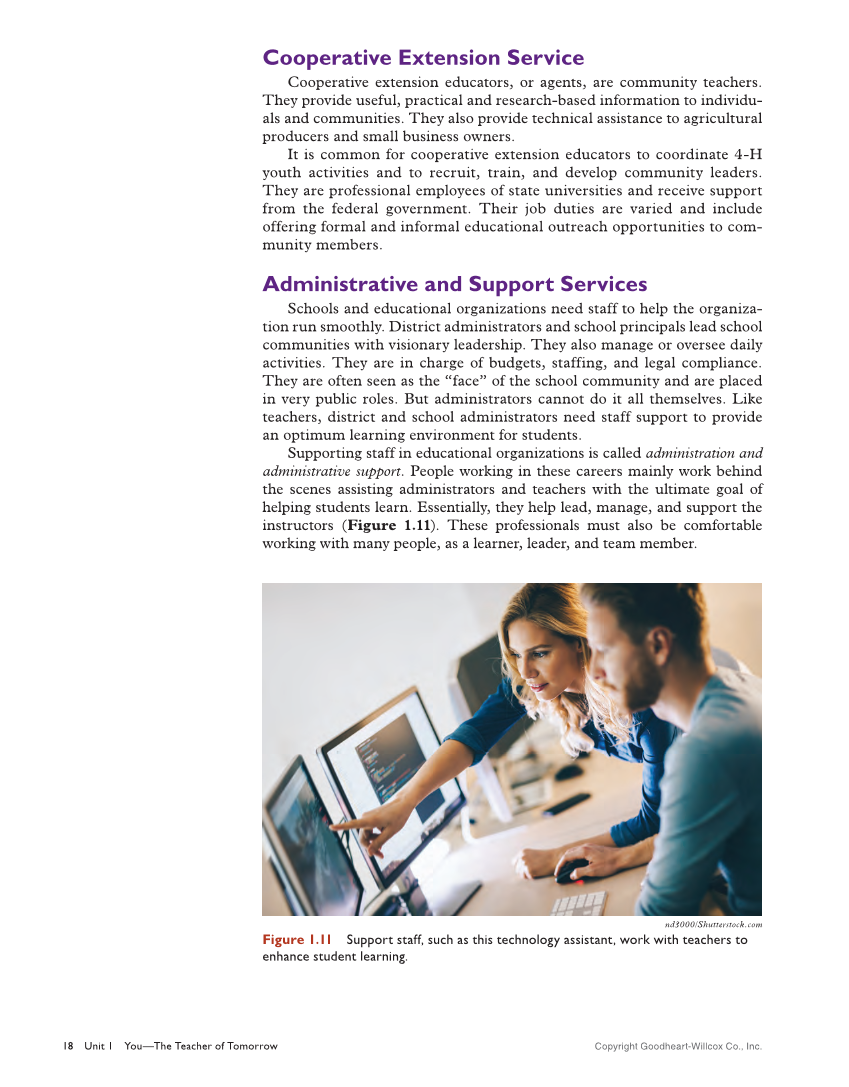 Copyright Goodheart-Willcox Co., Inc. 18 Unit 1 You—The Teacher of Tomorrow Cooperative Extension Service Cooperative extension educators, or agents, are community teachers. They provide useful, practical and research-based information to individu- als and communities. They also provide technical assistance to agricultural producers and small business owners. It is common for cooperative extension educators to coordinate 4-H youth activities and to recruit, train, and develop community leaders. They are professional employees of state universities and receive support from the federal government. Their job duties are varied and include offering formal and informal educational outreach opportunities to com- munity members. Administrative and Support Services Schools and educational organizations need staff to help the organiza- tion run smoothly. District administrators and school principals lead school communities with visionary leadership. They also manage or oversee daily activities. They are in charge of budgets, staffing, and legal compliance. They are often seen as the “face” of the school community and are placed in very public roles. But administrators cannot do it all themselves. Like teachers, district and school administrators need staff support to provide an optimum learning environment for students. Supporting staff in educational organizations is called administration and administrative support. People working in these careers mainly work behind the scenes assisting administrators and teachers with the ultimate goal of helping students learn. Essentially, they help lead, manage, and support the instructors (Figure 1.11). These professionals must also be comfortable working with many people, as a learner, leader, and team member. nd3000/Shutterstock.com Figure 1.11 Support staff, such as this technology assistant, work with teachers to enhance student learning.