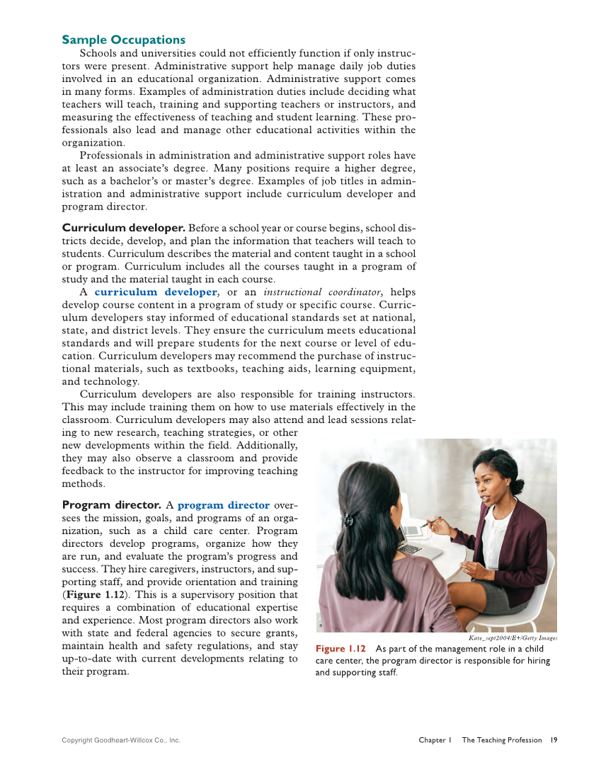 Copyright Goodheart-Willcox Co., Inc. Chapter 1 The Teaching Profession 19 Sample Occupations Schools and universities could not efficiently function if only instruc- tors were present. Administrative support help manage daily job duties involved in an educational organization. Administrative support comes in many forms. Examples of administration duties include deciding what teachers will teach, training and supporting teachers or instructors, and measuring the effectiveness of teaching and student learning. These pro- fessionals also lead and manage other educational activities within the organization. Professionals in administration and administrative support roles have at least an associate’s degree. Many positions require a higher degree, such as a bachelor’s or master’s degree. Examples of job titles in admin- istration and administrative support include curriculum developer and program director. Curriculum developer. Before a school year or course begins, school dis- tricts decide, develop, and plan the information that teachers will teach to students. Curriculum describes the material and content taught in a school or program. Curriculum includes all the courses taught in a program of study and the material taught in each course. A curriculum developer, or an instructional coordinator, helps develop course content in a program of study or specific course. Curric- ulum developers stay informed of educational standards set at national, state, and district levels. They ensure the curriculum meets educational standards and will prepare students for the next course or level of edu- cation. Curriculum developers may recommend the purchase of instruc- tional materials, such as textbooks, teaching aids, learning equipment, and technology. Curriculum developers are also responsible for training instructors. This may include training them on how to use materials effectively in the classroom. Curriculum developers may also attend and lead sessions relat- ing to new research, teaching strategies, or other new developments within the field. Additionally, they may also observe a classroom and provide feedback to the instructor for improving teaching methods. Program director. A program director over- sees the mission, goals, and programs of an orga- nization, such as a child care center. Program directors develop programs, organize how they are run, and evaluate the program’s progress and success. They hire caregivers, instructors, and sup- porting staff, and provide orientation and training (Figure 1.12). This is a supervisory position that requires a combination of educational expertise and experience. Most program directors also work with state and federal agencies to secure grants, maintain health and safety regulations, and stay up-to-date with current developments relating to their program. Kate_sept2004/E+/Getty Images Figure 1.12 As part of the management role in a child care center, the program director is responsible for hiring and supporting staff.