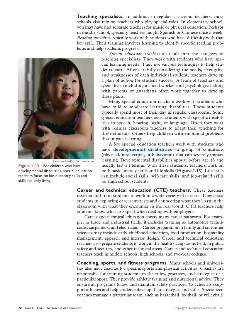 Copyright Goodheart-Willcox Co., Inc. 20 Unit 1 You—The Teacher of Tomorrow Teaching specialists. In addition to regular classroom teachers, most schools also rely on teachers who play special roles. In elementary school, you may have had separate teachers for music or physical education. Perhaps in middle school, specialty teachers taught Spanish or Chinese once a week. Reading specialists typically work with students who have difficulty with that key skill. Their training involves learning to identify specific reading prob- lems and help students progress. Special education teachers also fall into the category of teaching specialists. They work with students who have spe- cial learning needs. They use various techniques to help stu- dents learn. After carefully considering the needs, strengths, and weaknesses of each individual student, teachers develop a plan of action for student success. A team of teachers and specialists (including a social worker and psychologist) along with parents or guardians often work together to develop these plans. Many special education teachers work with students who have mild to moderate learning disabilities. These students typically spend most of their day in regular classrooms. Some special education teachers assist students with specific disabil- ities in speech, hearing, sight, or language. Often they work with regular classroom teachers to adapt their teaching for these students. Others help children with emotional problems that impact learning. A few special education teachers work with students who have developmental disabilities—a group of conditions (physical, intellectual, or behavioral) that can severely impact learning. Developmental disabilities appear before age 18 and usually last a lifetime. With these students, teachers work on both basic literacy skills and life skills (Figure 1.13). Life skills can include social skills, self-care skills, and job-related skills for high school students. Career and technical education (CTE) teachers. These teachers instruct and train students to work in a wide variety of careers. They assist students in exploring career interests and connecting what they learn in the classroom with what they encounter in the real world. CTE teachers help students know what to expect when dealing with employers. Career and technical education covers many career pathways. For exam- ple, in trade and industrial fields, it includes training as automotive techni- cians, carpenters, and electricians. Career preparation in family and consumer sciences may include early childhood education, food production, hospitality management, apparel, and interior design. Career and technical education teachers also prepare students to work in the health occupations field, in public safety and security, and other technical areas. Career and technical education teachers teach in middle schools, high schools, and two-year colleges. Coaching, sports, and fitness programs. Many schools and universi- ties also have coaches for specific sports and physical activities. Coaches are responsible for training students in the rules, practices, and strategies of a particular sport. They provide athletic training and nutritional advice. They ensure all programs follow and maintain safety practices. Coaches also sup- port athletes and help students develop their strategies and skills. Specialized coaches manage a particular team, such as basketball, football, or volleyball. Boontoom Sae-Kor/Shutterstock.com Figure 1.13 For children who have developmental disabilities, special education teachers focus on basic literacy skills and skills for daily living.