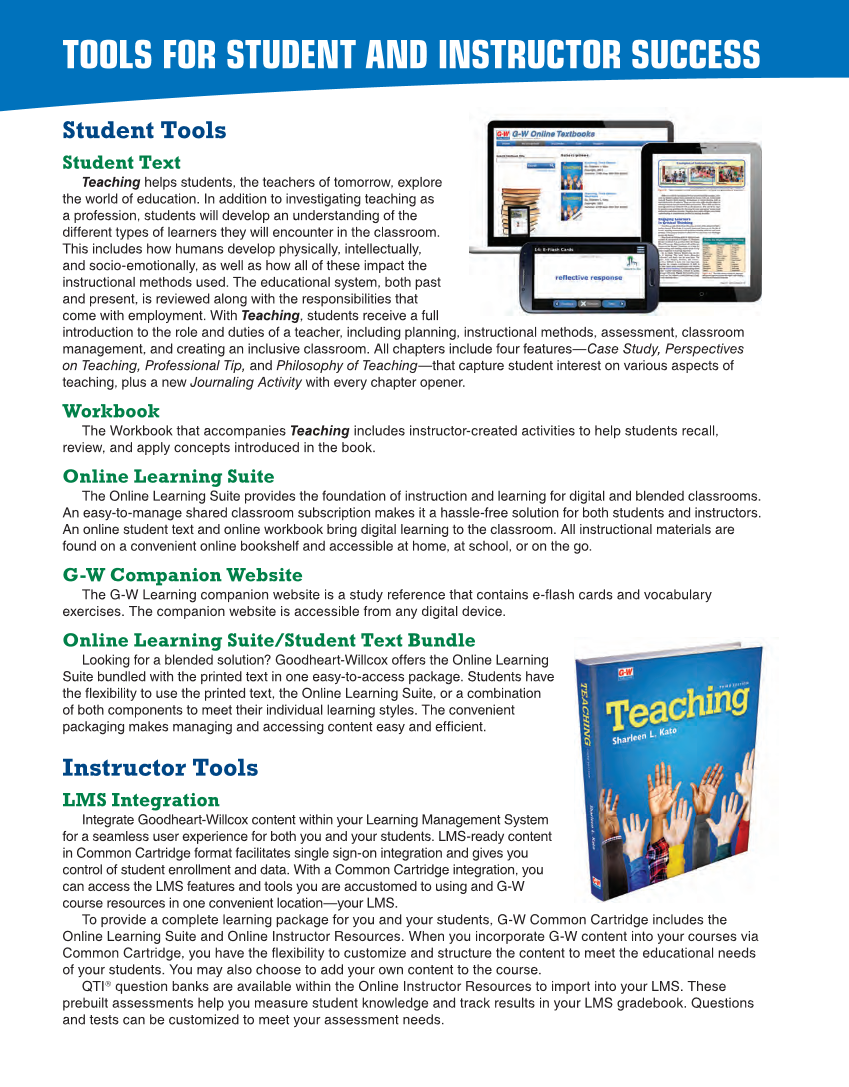 TOOLS FOR STUDENT AND INSTRUCTOR SUCCESS Student Tools Student Text Teaching helps students, the teachers of tomorrow, explore the world of education. In addition to investigating teaching as a profession, students will develop an understanding of the different types of learners they will encounter in the classroom. This includes how humans develop physically, intellectually, and socio-emotionally, as well as how all of these impact the instructional methods used. The educational system, both past and present, is reviewed along with the responsibilities that come with employment. With Teaching, students receive a full introduction to the role and duties of a teacher, including planning, instructional methods, assessment, classroom management, and creating an inclusive classroom. All chapters include four features—Case Study, Perspectives on Teaching, Professional Tip, and Philosophy of Teaching—that capture student interest on various aspects of teaching, plus a new Journaling Activity with every chapter opener. Workbook The Workbook that accompanies Teaching includes instructor-created activities to help students recall, review, and apply concepts introduced in the book. Online Learning Suite The Online Learning Suite provides the foundation of instruction and learning for digital and blended classrooms. An easy-to-manage shared classroom subscription makes it a hassle-free solution for both students and instructors. An online student text and online workbook bring digital learning to the classroom. All instructional materials are found on a convenient online bookshelf and accessible at home, at school, or on the go. G-W Companion Website The G-W Learning companion website is a study reference that contains e-flash cards and vocabulary exercises. The companion website is accessible from any digital device. Online Learning Suite/Student Text Bundle Looking for a blended solution? Goodheart-Willcox offers the Online Learning Suite bundled with the printed text in one easy-to-access package. Students have the flexibility to use the printed text, the Online Learning Suite, or a combination of both components to meet their individual learning styles. The convenient packaging makes managing and accessing content easy and efficient. Instructor Tools LMS Integration Integrate Goodheart-Willcox content within your Learning Management System for a seamless user experience for both you and your students. LMS-ready content in Common Cartridge format facilitates single sign-on integration and gives you control of student enrollment and data. With a Common Cartridge integration, you can access the LMS features and tools you are accustomed to using and G-W course resources in one convenient location—your LMS. To provide a complete learning package for you and your students, G-W Common Cartridge includes the Online Learning Suite and Online Instructor Resources. When you incorporate G-W content into your courses via Common Cartridge, you have the flexibility to customize and structure the content to meet the educational needs of your students. You may also choose to add your own content to the course. QTI® question banks are available within the Online Instructor Resources to import into your LMS. These prebuilt assessments help you measure student knowledge and track results in your LMS gradebook. Questions and tests can be customized to meet your assessment needs.