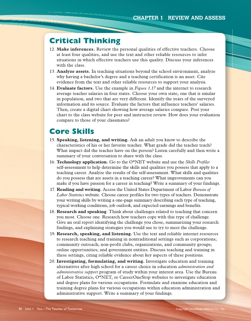 CHAPTER 1 REVIEW AND ASSESS 30 Unit 1 You—The Teacher of Tomorrow Copyright Goodheart-Willcox Co., Inc. Critical Thinking 12. Make inferences. Review the personal qualities of effective teachers. Choose at least four qualities, and use the text and other reliable resources to infer situations in which effective teachers use this quality. Discuss your inferences with the class. 13. Analyze assets. In teaching situations beyond the school environment, analyze why having a bachelor’s degree and a teaching certification is an asset. Cite evidence from the text and other reliable resources to support your analysis. 14. Evaluate factors. Use the example in Figure 1.17 and the internet to research average teacher salaries in four states. Choose your own state, one that is similar in population, and two that are very different. Identify the years of the surveyed information and its source. Evaluate the factors that influence teachers’ salaries. Then, create a digital chart showing how average salaries compare. Post your chart to the class website for peer and instructor review. How does your evaluation compare to those of your classmates? Core Skills 15. Speaking, listening, and writing. Ask an adult you know to describe the characteristics of his or her favorite teacher. What grade did the teacher teach? What impact did the teacher have on the person? Listen carefully and then write a summary of your conversation to share with the class. 16. Technology application. Go to the O*NET website and use the Skills Profiler self-assessment to help determine the skills and qualities you possess that apply to a teaching career. Analyze the results of the self-assessment. What skills and qualities do you possess that are assets in a teaching career? What improvements can you make if you have passion for a career in teaching? Write a summary of your findings. 17. Reading and writing. Access the United States Department of Labor Bureau of Labor Statistics website. Choose career profiles for two types of teachers. Demonstrate your writing skills by writing a one-page summary describing each type of teaching, typical working conditions, job outlook, and expected earnings and benefits. 18. Research and speaking. Think about challenges related to teaching that concern you most. Choose one. Research how teachers cope with this type of challenge. Give an oral report identifying the challenge you chose, summarizing your research findings, and explaining strategies you would use to try to meet the challenge. 19. Research, speaking, and listening. Use the text and reliable internet resources to research teaching and training in nontraditional settings such as corporations community outreach non-profit clubs, organizations, and community groups online opportunities and government entities. Discuss teaching and training in these settings, citing reliable evidence about key aspects of these positions. 20. Investigating, formulating, and writing. Investigate education and training alternatives after high school for a career choice in education administration and administrative support program of study within your interest area. Use the Bureau of Labor Statistics, O*NET, or CareerOneStop websites to investigate education and degree plans for various occupations. Formulate and examine education and training degree plans for various occupations within education administration and administrative support. Write a summary of your findings.