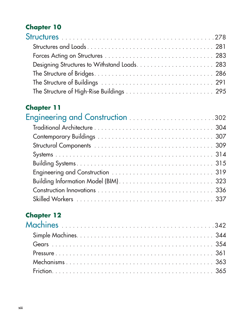 xii Chapter 10 Structures . . . . . . . . . . . . . . . . . . . . . . . . . . . . . . . . . . . . . . . . .278 Structures and Loads . . . . . . . . . . . . . . . . . . . . . . . . . . . . . . . . . . . . 281 Forces Acting on Structures . . . . . . . . . . . . . . . . . . . . . . . . . . . . . . . 283 Designing Structures to Withstand Loads. . . . . . . . . . . . . . . . . . . . . . 283 The Structure of Bridges. . . . . . . . . . . . . . . . . . . . . . . . . . . . . . . . . . 286 The Structure of Buildings . . . . . . . . . . . . . . . . . . . . . . . . . . . . . . . . 291 The Structure of High-Rise Buildings . . . . . . . . . . . . . . . . . . . . . . . . . 295 Chapter 11 Engineering and Construction . . . . . . . . . . . . . . . . . . . . . . .302 Traditional Architecture . . . . . . . . . . . . . . . . . . . . . . . . . . . . . . . . . . 304 Contemporary Buildings . . . . . . . . . . . . . . . . . . . . . . . . . . . . . . . . . 307 Structural Components . . . . . . . . . . . . . . . . . . . . . . . . . . . . . . . . . . 309 Systems . . . . . . . . . . . . . . . . . . . . . . . . . . . . . . . . . . . . . . . . . . . . . 314 Building Systems. . . . . . . . . . . . . . . . . . . . . . . . . . . . . . . . . . . . . . . 315 Engineering and Construction . . . . . . . . . . . . . . . . . . . . . . . . . . . . . 319 Building Information Model (BIM). . . . . . . . . . . . . . . . . . . . . . . . . . . 323 Construction Innovations . . . . . . . . . . . . . . . . . . . . . . . . . . . . . . . . . 336 Skilled Workers . . . . . . . . . . . . . . . . . . . . . . . . . . . . . . . . . . . . . . . 337 Chapter 12 Machines . . . . . . . . . . . . . . . . . . . . . . . . . . . . . . . . . . . . . . . . .342 Simple Machines. . . . . . . . . . . . . . . . . . . . . . . . . . . . . . . . . . . . . . . 344 Gears . . . . . . . . . . . . . . . . . . . . . . . . . . . . . . . . . . . . . . . . . . . . . . 354 Pressure . . . . . . . . . . . . . . . . . . . . . . . . . . . . . . . . . . . . . . . . . . . . . 361 Mechanisms . . . . . . . . . . . . . . . . . . . . . . . . . . . . . . . . . . . . . . . . . . 363 Friction. . . . . . . . . . . . . . . . . . . . . . . . . . . . . . . . . . . . . . . . . . . . . . 365
