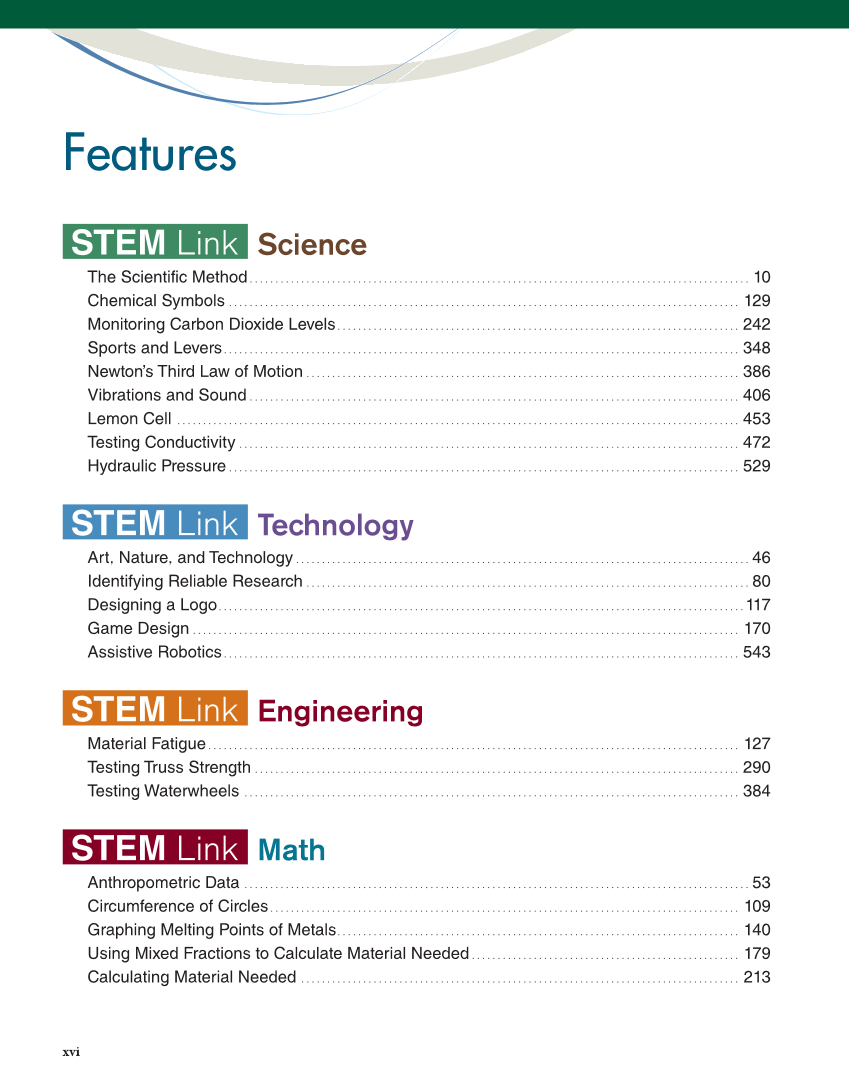 xvi Features STEM STEM Link Link Science The Scientific Method ................................................................................................. 10 Chemical Symbols ................................................................................................... 129 Monitoring Carbon Dioxide Levels .............................................................................. 242 Sports and Levers .................................................................................................... 348 Newton’s Third Law of Motion .................................................................................... 386 Vibrations and Sound ............................................................................................... 406 Lemon Cell ............................................................................................................. 453 Testing Conductivity ................................................................................................. 472 Hydraulic Pressure ................................................................................................... 529 STEM STEM Link Link Technology Art, Nature, and Technology ........................................................................................ 46 Identifying Reliable Research ...................................................................................... 80 Designing a Logo ......................................................................................................117 Game Design .......................................................................................................... 170 Assistive Robotics .................................................................................................... 543 STEM STEM Link Link Engineering Material Fatigue ....................................................................................................... 127 Testing Truss Strength .............................................................................................. 290 Testing Waterwheels ................................................................................................ 384 STEM STEM Link Link Math Anthropometric Data .................................................................................................. 53 Circumference of Circles ........................................................................................... 109 Graphing Melting Points of Metals.............................................................................. 140 Using Mixed Fractions to Calculate Material Needed .................................................... 179 Calculating Material Needed ..................................................................................... 213