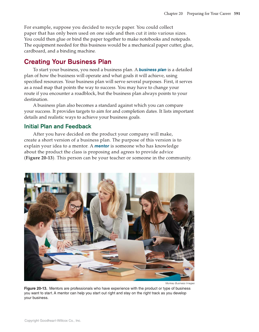 Chapter 20 Preparing for Your Career 591 Copyright Goodheart-Willcox Co., Inc. For example, suppose you decided to recycle paper. You could collect paper that has only been used on one side and then cut it into various sizes. You could then glue or bind the paper together to make notebooks and notepads. The equipment needed for this business would be a mechanical paper cutter, glue, cardboard, and a binding machine. Creating Your Business Plan To start your business, you need a business plan. A business plan is a detailed plan of how the business will operate and what goals it will achieve, using specifi ed resources. Your business plan will serve several purposes. First, it serves as a road map that points the way to success. You may have to change your route if you encounter a roadblock, but the business plan always points to your destination. A business plan also becomes a standard against which you can compare your success. It provides targets to aim for and completion dates. It lists important details and realistic ways to achieve your business goals. Initial Plan and Feedback After you have decided on the product your company will make, create a short version of a business plan. The purpose of this version is to explain your idea to a mentor. A mentor is someone who has knowledge about the product the class is proposing and agrees to provide advice (Figure 20-13). This person can be your teacher or someone in the community. Monkey Business Images Figure 20-13. Mentors are professionals who have experience with the product or type of business you want to start. A mentor can help you start out right and stay on the right track as you develop your business.