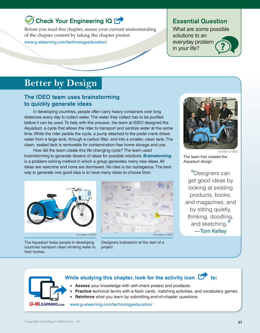 43 Copyright Goodheart-Willcox Co., Inc. Better by Design Better by Design Check Your Engineering IQ Before you read this chapter, assess your current understanding of the chapter content by taking the chapter pretest. www.g-wlearning.com/technologyeducation/ Courtesy of IDEO The team that created the Aquaduct design. “Designers can get good ideas by looking at existing products, books, and magazines and by sitting quietly, thinking, doodling, and sketching.” —Tom Kelley While studying this chapter, look for the activity icon to: • Assess your knowledge with self-check pretest and posttests. • Practice technical terms with e-flash cards, matching activities, and vocabulary games. • Reinforce what you learn by submitting end-of-chapter questions. www.g-wlearning.com/technologyeducation/ Essential Question What are some possible solutions to an everyday problem in your life? The IDEO team uses brainstorming to quickly generate ideas In developing countries, people often carry heavy containers over long distances every day to collect water. The water they collect has to be purified before it can be used. To help with this process, the team at IDEO designed the Aquaduct, a cycle that allows the rider to transport and sanitize water at the same time. While the rider pedals the cycle, a pump attached to the pedal crank draws water from a large tank, through a carbon filter, and into a smaller, clean tank. The clean, sealed tank is removable for contamination-free home storage and use. How did the team create this life-changing cycle? The team used brainstorming to generate dozens of ideas for possible solutions. Brainstorming is a problem-solving method in which a group generates many new ideas. All ideas are welcome and none are dismissed. No idea is too outrageous. The best way to generate one good idea is to have many ideas to choose from. Courtesy of IDEO The Aquaduct helps people in developing countries transport clean drinking water to their homes. Courtesy of IDEO Designers brainstorm at the start of a project.