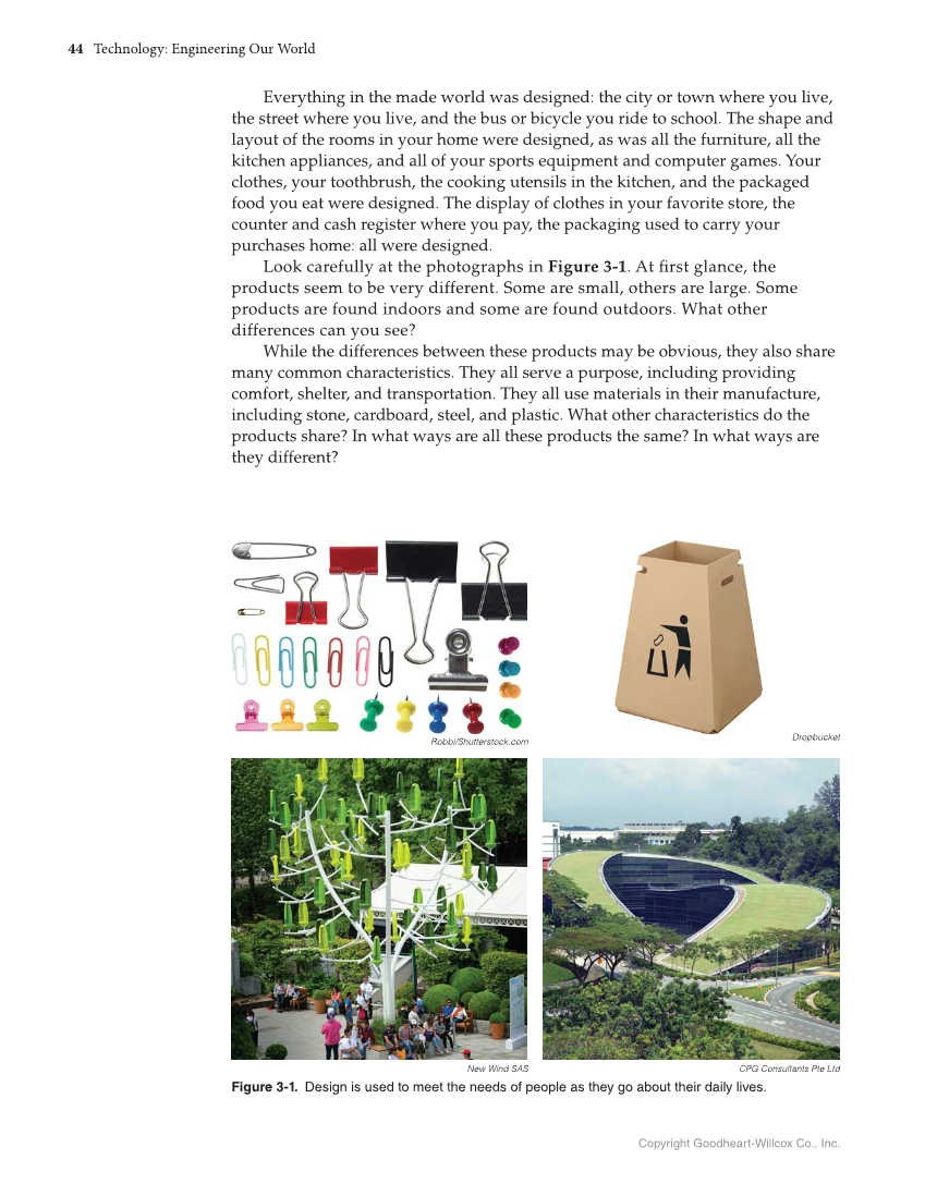 44 Technology: Engineering Our World Copyright Goodheart-Willcox Co., Inc. Everything in the made world was designed: the city or town where you live, the street where you live, and the bus or bicycle you ride to school. The shape and layout of the rooms in your home were designed, as was all the furniture, all the kitchen appliances, and all of your sports equipment and computer games. Your clothes, your toothbrush, the cooking utensils in the kitchen, and the packaged food you eat were designed. The display of clothes in your favorite store, the counter and cash register where you pay, the packaging used to carry your purchases home: all were designed. Look carefully at the photographs in Figure 3-1. At fi rst glance, the products seem to be very different. Some are small, others are large. Some products are found indoors and some are found outdoors. What other differences can you see? While the differences between these products may be obvious, they also share many common characteristics. They all serve a purpose, including providing comfort, shelter, and transportation. They all use materials in their manufacture, including stone, cardboard, steel, and plastic. What other characteristics do the products share? In what ways are all these products the same? In what ways are they different? CPG Consultants Pte Ltd Figure 3-1. Design is used to meet the needs of people as they go about their daily lives. Robbi/Shutterstock.com Dropbucket New Wind SAS