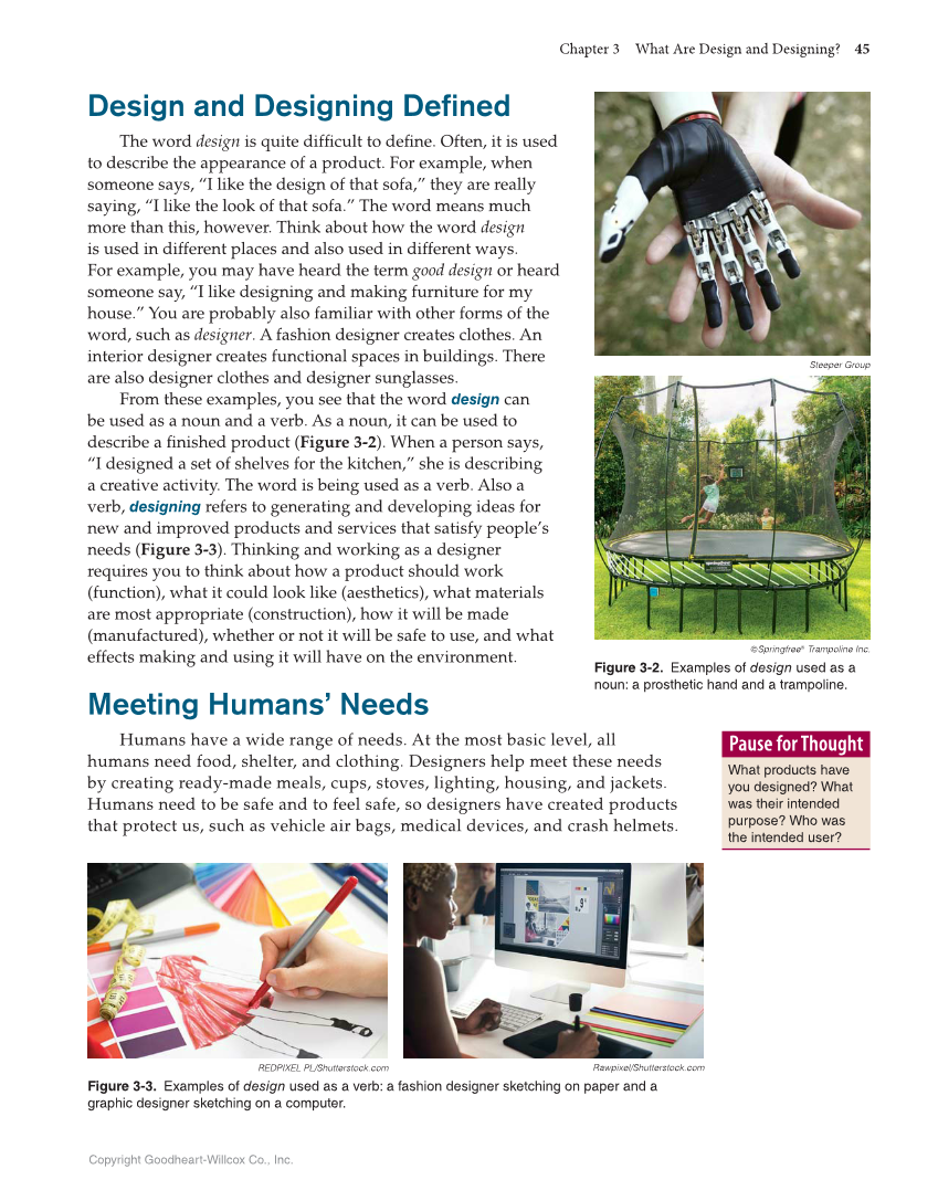 Chapter 3 What Are Design and Designing? 45 Copyright Goodheart-Willcox Co., Inc. Design and Designing Defined The word design is quite diffi cult to defi ne. Often, it is used to describe the appearance of a product. For example, when someone says, “I like the design of that sofa,” they are really saying, “I like the look of that sofa.” The word means much more than this, however. Think about how the word design is used in different places and also used in different ways. For example, you may have heard the term good design or heard someone say, “I like designing and making furniture for my house.” You are probably also familiar with other forms of the word, such as designer. A fashion designer creates clothes. An interior designer creates functional spaces in buildings. There are also designer clothes and designer sunglasses. From these examples, you see that the word design can be used as a noun and a verb. As a noun, it can be used to describe a fi nished product (Figure 3-2). When a person says, “I designed a set of shelves for the kitchen,” she is describing a creative activity. The word is being used as a verb. Also a verb, designing refers to generating and developing ideas for new and improved products and services that satisfy people’s needs (Figure 3-3). Thinking and working as a designer requires you to think about how a product should work (function), what it could look like (aesthetics), what materials are most appropriate (construction), how it will be made (manufactured), whether or not it will be safe to use, and what effects making and using it will have on the environment. Meeting Humans’ Needs Humans have a wide range of needs. At the most basic level, all humans need food, shelter, and clothing. Designers help meet these needs by creating ready-made meals, cups, stoves, lighting, housing, and jackets. Humans need to be safe and to feel safe, so designers have created products that protect us, such as vehicle air bags, medical devices, and crash helmets. Pause for Thought What products have you designed? What was their intended purpose? Who was the intended user? ©Springfree® Trampoline Inc. Figure 3-2. Examples of design used as a noun: a prosthetic hand and a trampoline. Steeper Group Rawpixel/Shutterstock.com Figure 3-3. Examples of design used as a verb: a fashion designer sketching on paper and a graphic designer sketching on a computer. REDPIXEL PL/Shutterstock.com