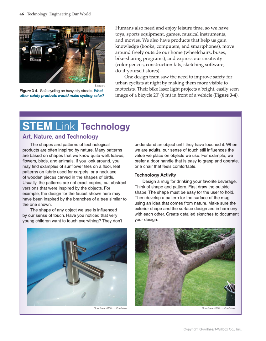 46 Technology: Engineering Our World Copyright Goodheart-Willcox Co., Inc. Humans also need and enjoy leisure time, so we have toys, sports equipment, games, musical instruments, and movies. We also have products that help us gain knowledge (books, computers, and smartphones), move around freely outside our home (wheelchairs, buses, bike-sharing programs), and express our creativity (color pencils, construction kits, sketching software, do-it-yourself stores). One design team saw the need to improve safety for urban cyclists at night by making them more visible to motorists. Their bike laser light projects a bright, easily seen image of a bicycle 20′ (6 m) in front of a vehicle (Figure 3-4). Blaze.cc Figure 3-4. Safe cycling on busy city streets. What other safety products would make cycling safer? STEM STEM Link Link Art, Nature, and Technology Technology The shapes and patterns of technological products are often inspired by nature. Many patterns are based on shapes that we know quite well: leaves, flowers, birds, and animals. If you look around, you may find examples of sunflower tiles on a floor, leaf patterns on fabric used for carpets, or a necklace of wooden pieces carved in the shapes of birds. Usually, the patterns are not exact copies, but abstract versions that were inspired by the objects. For example, the design for the faucet shown here may have been inspired by the branches of a tree similar to the one shown. The shape of any object we use is influenced by our sense of touch. Have you noticed that very young children want to touch everything? They don’t understand an object until they have touched it. When we are adults, our sense of touch still influences the value we place on objects we use. For example, we prefer a door handle that is easy to grasp and operate, or a chair that feels comfortable. Technology Activity Design a mug for drinking your favorite beverage. Think of shape and pattern. First draw the outside shape. The shape must be easy for the user to hold. Then develop a pattern for the surface of the mug using an idea that comes from nature. Make sure the exterior shape and the surface design are in harmony with each other. Create detailed sketches to document your design. Goodheart-Willcox Publisher Goodheart-Willcox Publisher