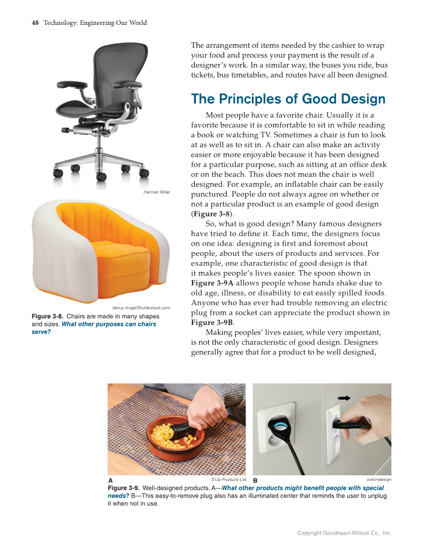 48 Technology: Engineering Our World Copyright Goodheart-Willcox Co., Inc. The arrangement of items needed by the cashier to wrap your food and process your payment is the result of a designer’s work. In a similar way, the buses you ride, bus tickets, bus timetables, and routes have all been designed. The Principles of Good Design Most people have a favorite chair. Usually it is a favorite because it is comfortable to sit in while reading a book or watching TV. Sometimes a chair is fun to look at as well as to sit in. A chair can also make an activity easier or more enjoyable because it has been designed for a particular purpose, such as sitting at an offi ce desk or on the beach. This does not mean the chair is well designed. For example, an infl atable chair can be easily punctured. People do not always agree on whether or not a particular product is an example of good design (Figure 3-8). So, what is good design? Many famous designers have tried to defi ne it. Each time, the designers focus on one idea: designing is fi rst and foremost about people, about the users of products and services. For example, one characteristic of good design is that it makes people’s lives easier. The spoon shown in Figure 3-9A allows people whose hands shake due to old age, illness, or disability to eat easily spilled foods. Anyone who has ever had trouble removing an electric plug from a socket can appreciate the product shown in Figure 3-9B. Making peoples’ lives easier, while very important, is not the only characteristic of good design. Designers generally agree that for a product to be well designed, swkimdesign Figure 3-9. Well-designed products. A—What other products might benefit people with special needs? B—This easy-to-remove plug also has an illuminated center that reminds the user to unplug it when not in use. A B S’Up Products Ltd. Venus Angel/Shutterstock.com Figure 3-8. Chairs are made in many shapes and sizes. What other purposes can chairs serve? Herman Miller