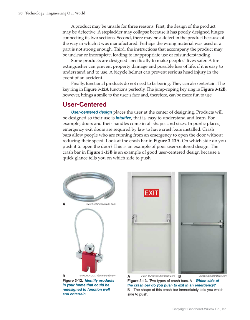 50 Technology: Engineering Our World Copyright Goodheart-Willcox Co., Inc. A product may be unsafe for three reasons. First, the design of the product may be defective. A stepladder may collapse because it has poorly designed hinges connecting its two sections. Second, there may be a defect in the product because of the way in which it was manufactured. Perhaps the wrong material was used or a part is not strong enough. Third, the instructions that accompany the product may be unclear or incomplete, leading to inappropriate use or misunderstanding. Some products are designed specifi cally to make peoples’ lives safer. A fi re extinguisher can prevent property damage and possible loss of life, if it is easy to understand and to use. A bicycle helmet can prevent serious head injury in the event of an accident. Finally, functional products do not need to be boring. They can also entertain. The key ring in Figure 3-12A functions perfectly. The jump-roping key ring in Figure 3-12B, however, brings a smile to the user’s face and, therefore, can be more fun to use. User-Centered User-centered design places the user at the center of designing. Products will be designed so their use is intuitive, that is, easy to understand and learn. For example, doors and their handles come in all shapes and sizes. In public places, emergency exit doors are required by law to have crash bars installed. Crash bars allow people who are running from an emergency to open the door without reducing their speed. Look at the crash bar in Figure 3-13A. On which side do you push it to open the door? This is an example of poor user-centered design. The crash bar in Figure 3-13B is an example of good user-centered design because a quick glance tells you on which side to push. B A ©TROIKA 2017 Germany GmbH Figure 3-12. Identify products in your home that could be redesigned to function well and entertain. AlexLMX/Shutterstock.com nicepix/Shutterstock.com Figure 3-13. Two types of crash bars. A—Which side of the crash bar do you push to exit in an emergency? B—The shape of this crash bar immediately tells you which side to push. A B Florin Burlan/Shutterstock.com