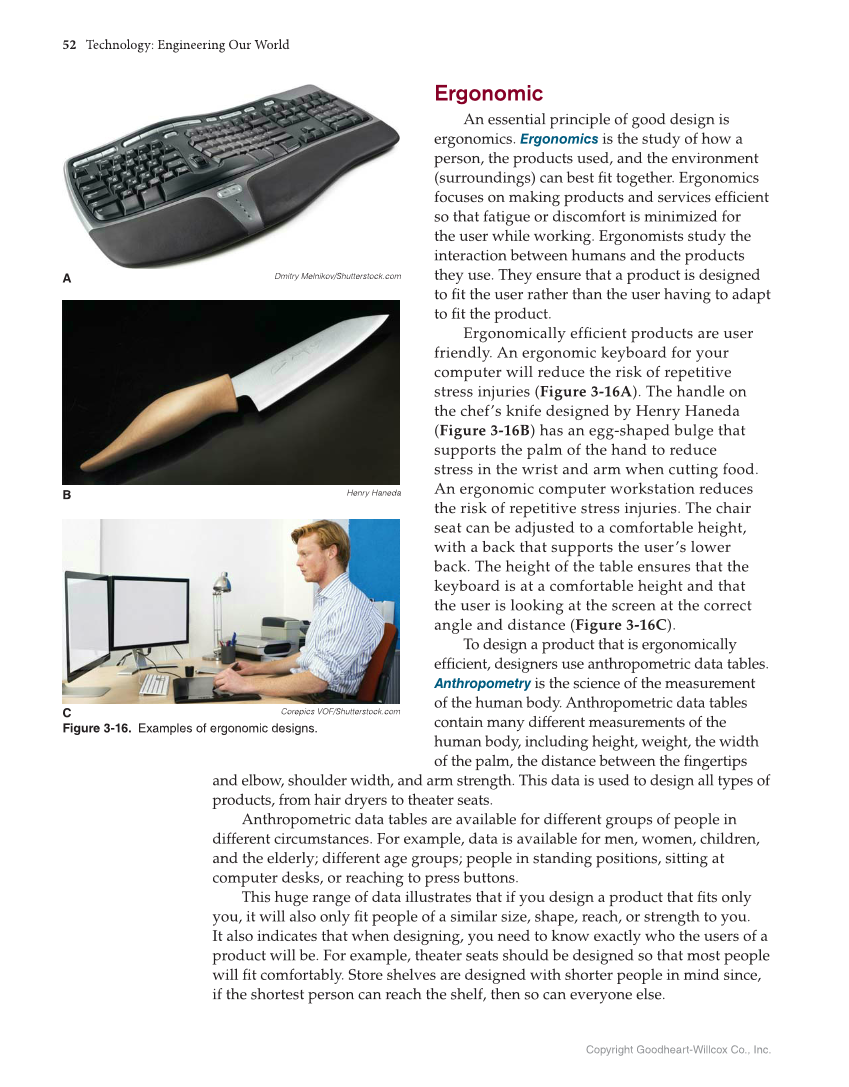 52 Technology: Engineering Our World Copyright Goodheart-Willcox Co., Inc. Ergonomic An essential principle of good design is ergonomics. Ergonomics is the study of how a person, the products used, and the environment (surroundings) can best fi t together. Ergonomics focuses on making products and services effi cient so that fatigue or discomfort is minimized for the user while working. Ergonomists study the interaction between humans and the products they use. They ensure that a product is designed to fi t the user rather than the user having to adapt to fi t the product. Ergonomically effi cient products are user friendly. An ergonomic keyboard for your computer will reduce the risk of repetitive stress injuries (Figure 3-16A). The handle on the chef’s knife designed by Henry Haneda (Figure 3-16B) has an egg-shaped bulge that supports the palm of the hand to reduce stress in the wrist and arm when cutting food. An ergonomic computer workstation reduces the risk of repetitive stress injuries. The chair seat can be adjusted to a comfortable height, with a back that supports the user’s lower back. The height of the table ensures that the keyboard is at a comfortable height and that the user is looking at the screen at the correct angle and distance (Figure 3-16C). To design a product that is ergonomically effi cient, designers use anthropometric data tables. Anthropometry is the science of the measurement of the human body. Anthropometric data tables contain many different measurements of the human body, including height, weight, the width of the palm, the distance between the fi ngertips and elbow, shoulder width, and arm strength. This data is used to design all types of products, from hair dryers to theater seats. Anthropometric data tables are available for different groups of people in different circumstances. For example, data is available for men, women, children, and the elderly different age groups people in standing positions, sitting at computer desks, or reaching to press buttons. This huge range of data illustrates that if you design a product that fi ts only you, it will also only fi t people of a similar size, shape, reach, or strength to you. It also indicates that when designing, you need to know exactly who the users of a product will be. For example, theater seats should be designed so that most people will fi t comfortably. Store shelves are designed with shorter people in mind since, if the shortest person can reach the shelf, then so can everyone else. A B C Corepics VOF/Shutterstock.com Figure 3-16. Examples of ergonomic designs. Henry Haneda Dmitry Melnikov/Shutterstock.com