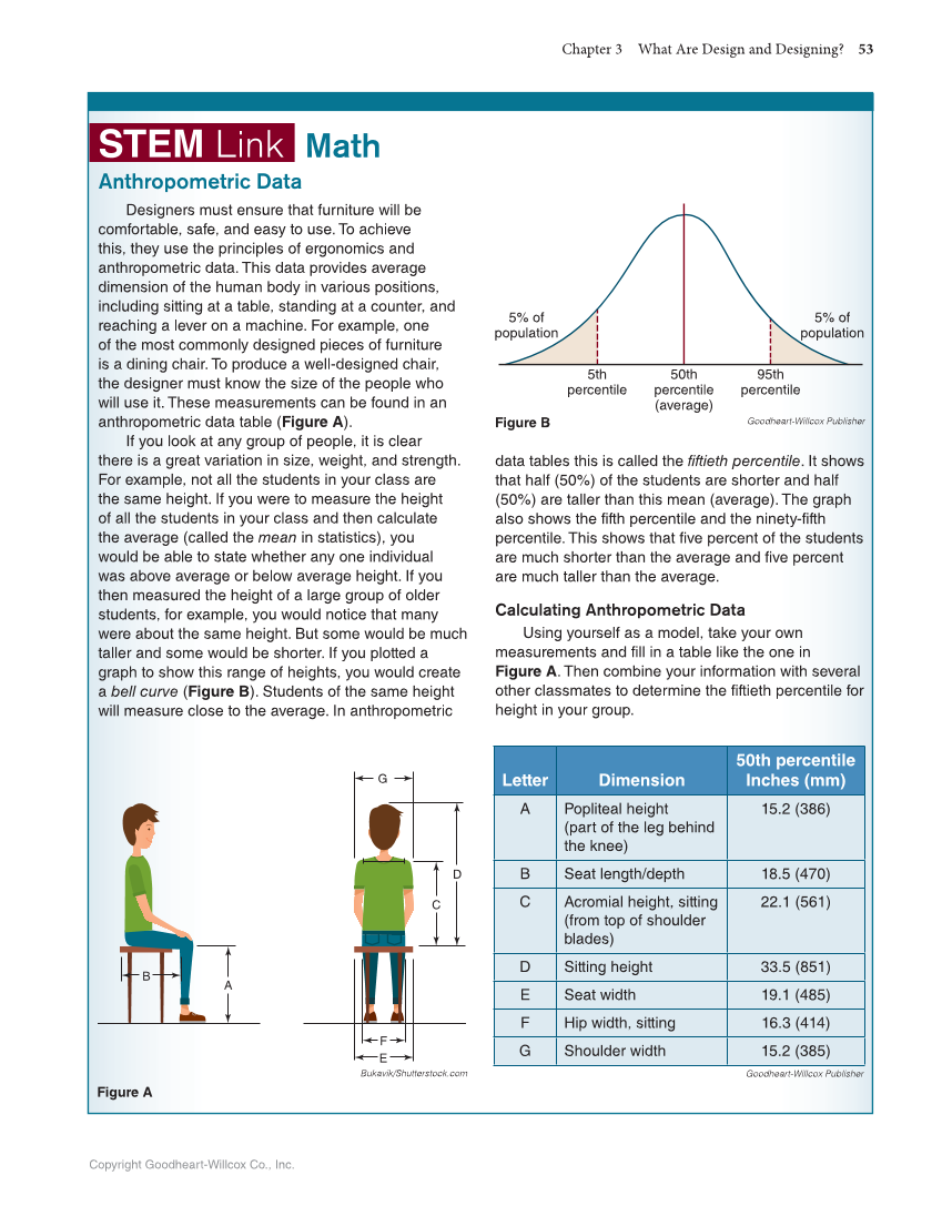 Chapter 3 What Are Design and Designing? 53 Copyright Goodheart-Willcox Co., Inc. STEM STEM Link Link Anthropometric Data Designers must ensure that furniture will be comfortable, safe, and easy to use. To achieve this, they use the principles of ergonomics and anthropometric data. This data provides average dimension of the human body in various positions, including sitting at a table, standing at a counter, and reaching a lever on a machine. For example, one of the most commonly designed pieces of furniture is a dining chair. To produce a well-designed chair, the designer must know the size of the people who will use it. These measurements can be found in an anthropometric data table (Figure A). If you look at any group of people, it is clear there is a great variation in size, weight, and strength. For example, not all the students in your class are the same height. If you were to measure the height of all the students in your class and then calculate the average (called the mean in statistics), you would be able to state whether any one individual was above average or below average height. If you then measured the height of a large group of older students, for example, you would notice that many were about the same height. But some would be much taller and some would be shorter. If you plotted a graph to show this range of heights, you would create a bell curve (Figure B). Students of the same height will measure close to the average. In anthropometric data tables this is called the fiftieth percentile. It shows that half (50%) of the students are shorter and half (50%) are taller than this mean (average). The graph also shows the fifth percentile and the ninety-fifth percentile. This shows that five percent of the students are much shorter than the average and five percent are much taller than the average. Calculating Anthropometric Data Using yourself as a model, take your own measurements and fill in a table like the one in Figure A. Then combine your information with several other classmates to determine the fiftieth percentile for height in your group. Math Goodheart-Willcox Publisher Figure A Letter Dimension 50th percentile Inches (mm) A Popliteal height (part of the leg behind the knee) 15.2 (386) B Seat length/depth 18.5 (470) C Acromial height, sitting (from top of shoulder blades) 22.1 (561) D Sitting height 33.5 (851) E Seat width 19.1 (485) F Hip width, sitting 16.3 (414) G Shoulder width 15.2 (385) E F G D A B C Bukavik/Shutterstock.com 5% of population 5% of population 50th percentile (average) 95th percentile 5th percentile Figure B Goodheart-Willcox Publisher