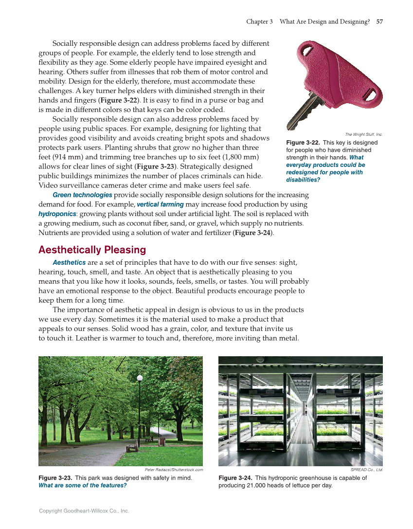 Chapter 3 What Are Design and Designing? 57 Copyright Goodheart-Willcox Co., Inc. Socially responsible design can address problems faced by different groups of people. For example, the elderly tend to lose strength and fl exibility as they age. Some elderly people have impaired eyesight and hearing. Others suffer from illnesses that rob them of motor control and mobility. Design for the elderly, therefore, must accommodate these challenges. A key turner helps elders with diminished strength in their hands and fi ngers (Figure 3-22). It is easy to fi nd in a purse or bag and is made in different colors so that keys can be color coded. Socially responsible design can also address problems faced by people using public spaces. For example, designing for lighting that provides good visibility and avoids creating bright spots and shadows protects park users. Planting shrubs that grow no higher than three feet (914 mm) and trimming tree branches up to six feet (1,800 mm) allows for clear lines of sight (Figure 3-23). Strategically designed public buildings minimizes the number of places criminals can hide. Video surveillance cameras deter crime and make users feel safe. Green technologies provide socially responsible design solutions for the increasing demand for food. For example, vertical farming may increase food production by using hydroponics: growing plants without soil under artifi cial light. The soil is replaced with a growing medium, such as coconut fi ber, sand, or gravel, which supply no nutrients. Nutrients are provided using a solution of water and fertilizer (Figure 3-24). Aesthetically Pleasing Aesthetics are a set of principles that have to do with our fi ve senses: sight, hearing, touch, smell, and taste. An object that is aesthetically pleasing to you means that you like how it looks, sounds, feels, smells, or tastes. You will probably have an emotional response to the object. Beautiful products encourage people to keep them for a long time. The importance of aesthetic appeal in design is obvious to us in the products we use every day. Sometimes it is the material used to make a product that appeals to our senses. Solid wood has a grain, color, and texture that invite us to touch it. Leather is warmer to touch and, therefore, more inviting than metal. The Wright Stuff, Inc. Figure 3-22. This key is designed for people who have diminished strength in their hands. What everyday products could be redesigned for people with disabilities? Peter Radacsi/Shutterstock.com Figure 3-23. This park was designed with safety in mind. What are some of the features? SPREAD Co., Ltd. Figure 3-24. This hydroponic greenhouse is capable of producing 21,000 heads of lettuce per day.