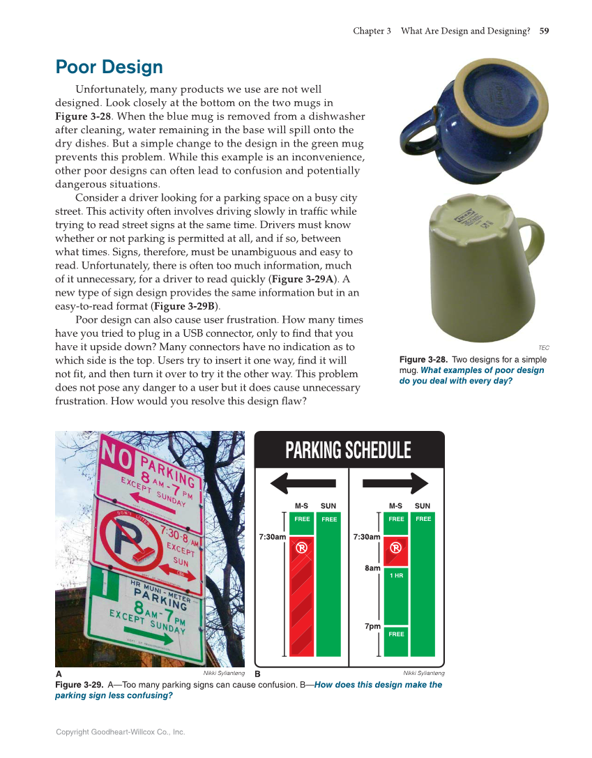 Chapter 3 What Are Design and Designing? 59 Copyright Goodheart-Willcox Co., Inc. Poor Design Unfortunately, many products we use are not well designed. Look closely at the bottom on the two mugs in Figure 3-28. When the blue mug is removed from a dishwasher after cleaning, water remaining in the base will spill onto the dry dishes. But a simple change to the design in the green mug prevents this problem. While this example is an inconvenience, other poor designs can often lead to confusion and potentially dangerous situations. Consider a driver looking for a parking space on a busy city street. This activity often involves driving slowly in traffi c while trying to read street signs at the same time. Drivers must know whether or not parking is permitted at all, and if so, between what times. Signs, therefore, must be unambiguous and easy to read. Unfortunately, there is often too much information, much of it unnecessary, for a driver to read quickly (Figure 3-29A). A new type of sign design provides the same information but in an easy-to-read format (Figure 3-29B). Poor design can also cause user frustration. How many times have you tried to plug in a USB connector, only to fi nd that you have it upside down? Many connectors have no indication as to which side is the top. Users try to insert it one way, fi nd it will not fi t, and then turn it over to try it the other way. This problem does not pose any danger to a user but it does cause unnecessary frustration. How would you resolve this design fl aw? TEC Figure 3-28. Two designs for a simple mug. What examples of poor design do you deal with every day? Nikki Sylianteng Figure 3-29. A—Too many parking signs can cause confusion. B—How does this design make the parking sign less confusing? SUN M-S 7pm 8am FREE FREE FREE FREE SUN M-S FREE 7:30am 7:30am 1 HR A B Nikki Sylianteng