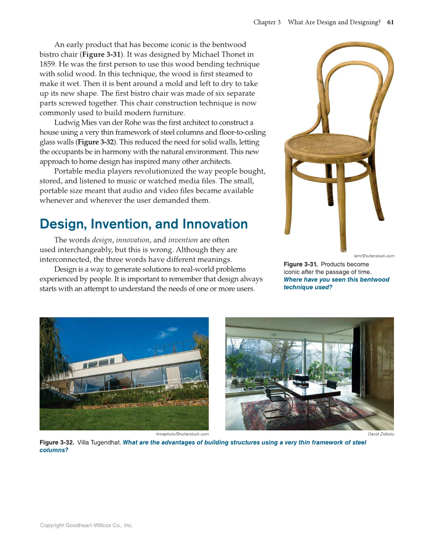 Chapter 3 What Are Design and Designing? 61 Copyright Goodheart-Willcox Co., Inc. An early product that has become iconic is the bentwood bistro chair (Figure 3-31). It was designed by Michael Thonet in 1859. He was the fi rst person to use this wood bending technique with solid wood. In this technique, the wood is fi rst steamed to make it wet. Then it is bent around a mold and left to dry to take up its new shape. The fi rst bistro chair was made of six separate parts screwed together. This chair construction technique is now commonly used to build modern furniture. Ludwig Mies van der Rohe was the fi rst architect to construct a house using a very thin framework of steel columns and fl oor-to-ceiling glass walls (Figure 3-32). This reduced the need for solid walls, letting the occupants be in harmony with the natural environment. This new approach to home design has inspired many other architects. Portable media players revolutionized the way people bought, stored, and listened to music or watched media fi les. The small, portable size meant that audio and video fi les became available whenever and wherever the user demanded them. Design, Invention, and Innovation The words design, innovation, and invention are often used interchangeably, but this is wrong. Although they are interconnected, the three words have different meanings. Design is a way to generate solutions to real-world problems experienced by people. It is important to remember that design always starts with an attempt to understand the needs of one or more users. Iem/Shutterstock.com Figure 3-31. Products become iconic after the passage of time. Where have you seen this bentwood technique used? David Zidlicky Figure 3-32. Villa Tugendhat. What are the advantages of building structures using a very thin framework of steel columns? Anrephoto/Shutterstock.com
