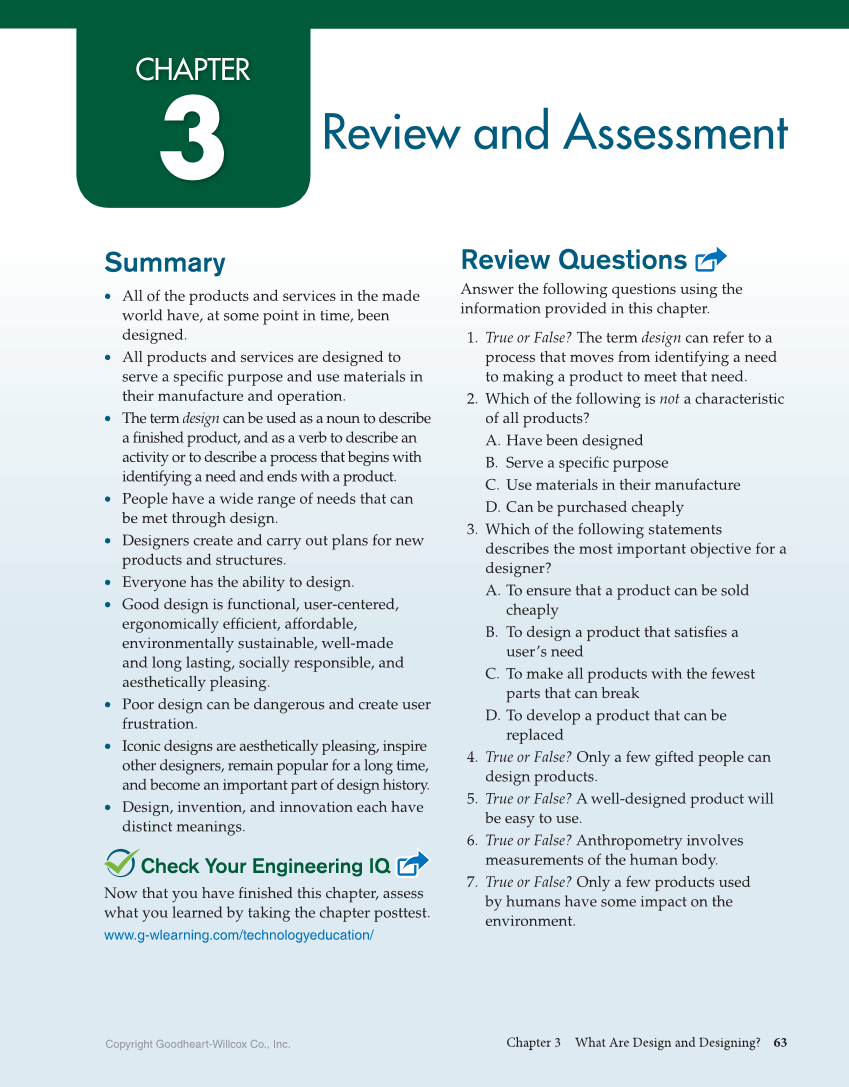Copyright Goodheart-Willcox Co., Inc. Chapter 3 What Are Design and Designing? 63 CHAPTER 3 Review and Assessment Summary • All of the products and services in the made world have, at some point in time, been designed. • All products and services are designed to serve a specifi c purpose and use materials in their manufacture and operation. • The term design can be used as a noun to describe a fi nished product, and as a verb to describe an activity or to describe a process that begins with identifying a need and ends with a product. • People have a wide range of needs that can be met through design. • Designers create and carry out plans for new products and structures. • Everyone has the ability to design. • Good design is functional, user-centered, ergonomically effi cient, affordable, environmentally sustainable, well-made and long lasting, socially responsible, and aesthetically pleasing. • Poor design can be dangerous and create user frustration. • Iconic designs are aesthetically pleasing, inspire other designers, remain popular for a long time, and become an important part of design history. • Design, invention, and innovation each have distinct meanings. Check Your Engineering IQ Now that you have finished this chapter, assess what you learned by taking the chapter posttest. www.g-wlearning.com/technologyeducation/ Review Questions Answer the following questions using the information provided in this chapter. 1. True or False? The term design can refer to a process that moves from identifying a need to making a product to meet that need. 2. Which of the following is not a characteristic of all products? A. Have been designed B. Serve a specifi c purpose C. Use materials in their manufacture D. Can be purchased cheaply 3. Which of the following statements describes the most important objective for a designer? A. To ensure that a product can be sold cheaply B. To design a product that satisfi es a user’s need C. To make all products with the fewest parts that can break D. To develop a product that can be replaced 4. True or False? Only a few gifted people can design products. 5. True or False? A well-designed product will be easy to use. 6. True or False? Anthropometry involves measurements of the human body. 7. True or False? Only a few products used by humans have some impact on the environment.