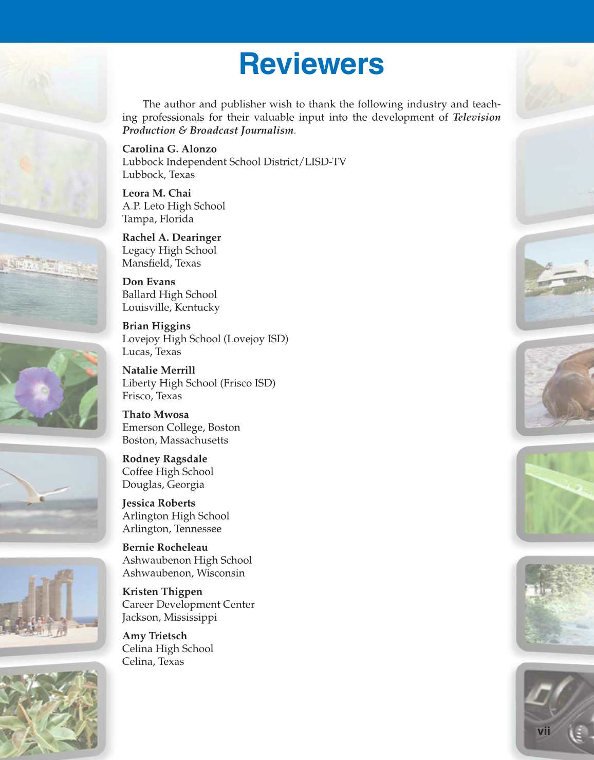 The author and publisher wish to thank the following industry and teach-