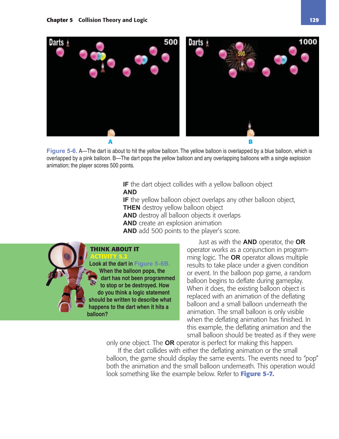 Figure 5-6. A—The dart is about to hit the yellow balloon. The yellow balloon is overlapped by a blue balloon, which is