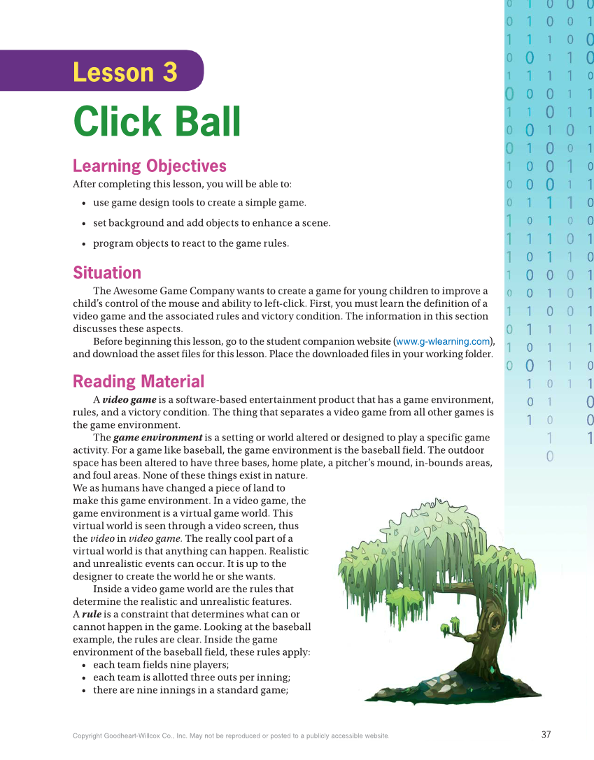 37 Copyright Goodheart-Willcox Co., Inc. May not be reproduced or posted to a publicly accessible website. y accessible website. 37 Lesson 3 Click Ball Learning Objectives After completing this lesson, you will be able to: • use game design tools to create a simple game. • set background and add objects to enhance a scene. • program objects to react to the game rules. Situation The Awesome Game Company wants to create a game for young children to improve a child’s control of the mouse and ability to left-click. First, you must learn the definition of a video game and the associated rules and victory condition. The information in this section discusses these aspects. Before beginning this lesson, go to the student companion website (www.g-wlearning.com), and download the asset files for this lesson. Place the downloaded files in your working folder. Reading Material A video game is a software-based entertainment product that has a game environment, rules, and a victory condition. The thing that separates a video game from all other games is the game environment. The game environment is a setting or world altered or designed to play a specific game activity. For a game like baseball, the game environment is the baseball field. The outdoor space has been altered to have three bases, home plate, a pitcher’s mound, in-bounds areas, and foul areas. None of these things exist in nature. We as humans have changed a piece of land to make this game environment. In a video game, the game environment is a virtual game world. This virtual world is seen through a video screen, thus the video in video game. The really cool part of a virtual world is that anything can happen. Realistic and unrealistic events can occur. It is up to the designer to create the world he or she wants. Inside a video game world are the rules that determine the realistic and unrealistic features. A rule is a constraint that determines what can or cannot happen in the game. Looking at the baseball example, the rules are clear. Inside the game environment of the baseball field, these rules apply: • each team fields nine players • each team is allotted three outs per inning • there are nine innings in a standard game