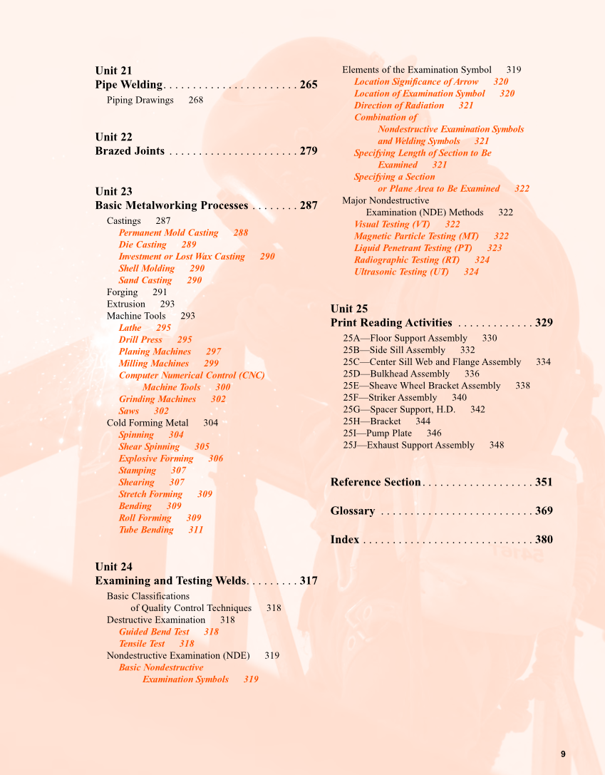 9 Unit 21 Pipe Welding. . . . . . . . . . . . . . . . . . . . . . . 265 Piping Drawings 268 Unit 22 Brazed Joints . . . . . . . . . . . . . . . . . . . . . . 279 Unit 23 Basic Metalworking Processes . . . . . . . . 287 Castings 287 Permanent Mold Casting 288 Die Casting 289 Investment or Lost Wax Casting 290 Shell Molding 290 Sand Casting 290 Forging 291 Extrusion 293 Machine Tools 293 Lathe 295 Drill Press 295 Planing Machines 297 Milling Machines 299 Computer Numerical Control (CNC) Machine Tools 300 Grinding Machines 302 Saws 302 Cold Forming Metal 304 Spinning 304 Shear Spinning 305 Explosive Forming 306 Stamping 307 Shearing 307 Stretch Forming 309 Bending 309 Roll Forming 309 Tube Bending 311 Unit 24 Examining and Testing Welds. . . . . . . . . 317 Basic Classifications of Quality Control Techniques 318 Destructive Examination 318 Guided Bend Test 318 Tensile Test 318 Nondestructive Examination (NDE) 319 Basic Nondestructive Examination Symbols 319 Elements of the Examination Symbol 319 Location Significance of Arrow 320 Location of Examination Symbol 320 Direction of Radiation 321 Combination of Nondestructive Examination Symbols and Welding Symbols 321 Specifying Length of Section to Be Examined 321 Specifying a Section or Plane Area to Be Examined 322 Major Nondestructive Examination (NDE) Methods 322 Visual Testing (VT) 322 Magnetic Particle Testing (MT) 322 Liquid Penetrant Testing (PT) 323 Radiographic Testing (RT) 324 Ultrasonic Testing (UT) 324 Unit 25 Print Reading Activities . . . . . . . . . . . . . 329 25A—Floor Support Assembly 330 25B—Side Sill Assembly 332 25C—Center Sill Web and Flange Assembly 334 25D—Bulkhead Assembly 336 25E—Sheave Wheel Bracket Assembly 338 25F—Striker Assembly 340 25G—Spacer Support, H.D. 342 25H—Bracket 344 25I—Pump Plate 346 25J—Exhaust Support Assembly 348 Reference Section. . . . . . . . . . . . . . . . . . . 351 Glossary . . . . . . . . . . . . . . . . . . . . . . . . . . 369 Index . . . . . . . . . . . . . . . . . . . . . . . . . . . . . 380