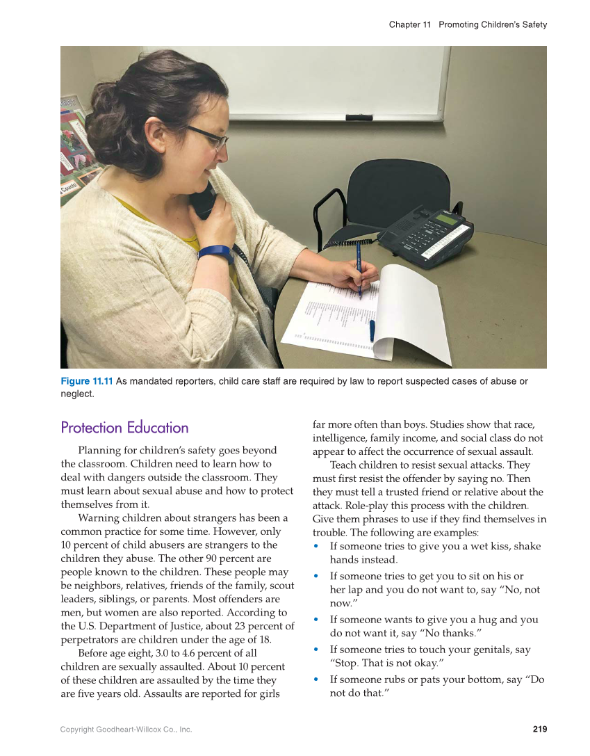Chapter 11 Promoting Children’s Safety Copyright Goodheart-Willcox Co., Inc. 219 Protection Education Planning for children’s safety goes beyond the classroom. Children need to learn how to deal with dangers outside the classroom. They must learn about sexual abuse and how to protect themselves from it. Warning children about strangers has been a common practice for some time. However, only 10 percent of child abusers are strangers to the children they abuse. The other 90 percent are people known to the children. These people may be neighbors, relatives, friends of the family, scout leaders, siblings, or parents. Most offenders are men, but women are also reported. According to the U.S. Department of Justice, about 23 percent of perpetrators are children under the age of 18. Before age eight, 3.0 to 4.6 percent of all children are sexually assaulted. About 10 percent of these children are assaulted by the time they are fi ve years old. Assaults are reported for girls far more often than boys. Studies show that race, intelligence, family income, and social class do not appear to affect the occurrence of sexual assault. Teach children to resist sexual attacks. They must fi rst resist the offender by saying no. Then they must tell a trusted friend or relative about the attack. Role-play this process with the children. Give them phrases to use if they fi nd themselves in trouble. The following are examples: • If someone tries to give you a wet kiss, shake hands instead. • If someone tries to get you to sit on his or her lap and you do not want to, say “No, not now.” • If someone wants to give you a hug and you do not want it, say “No thanks.” • If someone tries to touch your genitals, say “Stop. That is not okay.” • If someone rubs or pats your bottom, say “Do not do that.” Figure 11.11 As mandated reporters, child care staff are required by law to report suspected cases of abuse or neglect.