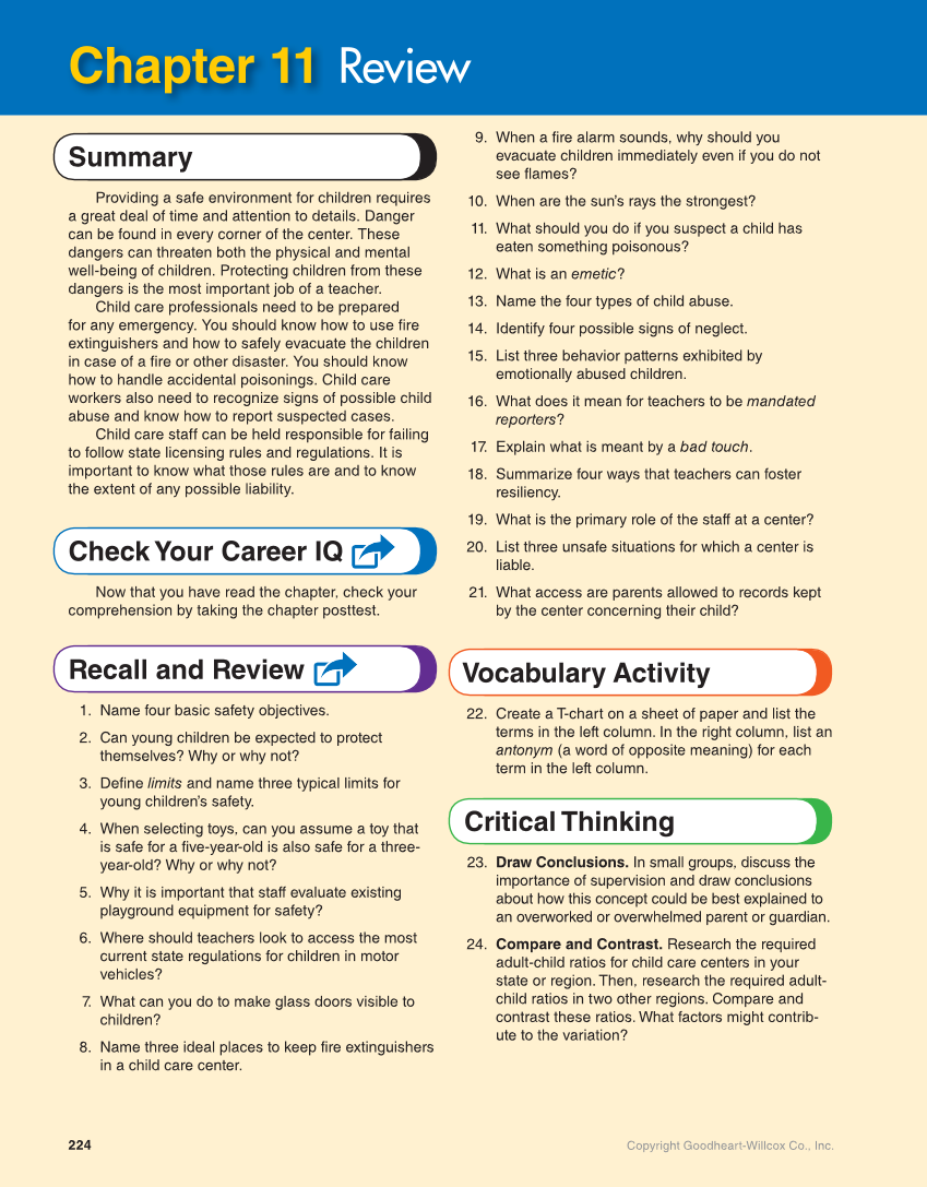 224 Copyright Goodheart-Willcox Co., Inc. Chapter 11 Review Providing a safe environment for children requires a great deal of time and attention to details. Danger can be found in every corner of the center. These dangers can threaten both the physical and mental well-being of children. Protecting children from these dangers is the most important job of a teacher. Child care professionals need to be prepared for any emergency. You should know how to use fire extinguishers and how to safely evacuate the children in case of a fire or other disaster. You should know how to handle accidental poisonings. Child care workers also need to recognize signs of possible child abuse and know how to report suspected cases. Child care staff can be held responsible for failing to follow state licensing rules and regulations. It is important to know what those rules are and to know the extent of any possible liability. Now that you have read the chapter, check your comprehension by taking the chapter posttest. 1. Name four basic safety objectives. 2. Can young children be expected to protect themselves? Why or why not? 3. Define limits and name three typical limits for young children’s safety. 4. When selecting toys, can you assume a toy that is safe for a five-year-old is also safe for a three- year-old? Why or why not? 5. Why it is important that staff evaluate existing playground equipment for safety? 6. Where should teachers look to access the most current state regulations for children in motor vehicles? 7. What can you do to make glass doors visible to children? 8. Name three ideal places to keep fire extinguishers in a child care center. Summary Check Your Career IQ Recall and Review 9. When a fire alarm sounds, why should you evacuate children immediately even if you do not see flames? 10. When are the sun’s rays the strongest? 11. What should you do if you suspect a child has eaten something poisonous? 12. What is an emetic? 13. Name the four types of child abuse. 14. Identify four possible signs of neglect. 15. List three behavior patterns exhibited by emotionally abused children. 16. What does it mean for teachers to be mandated reporters? 17. Explain what is meant by a bad touch. 18. Summarize four ways that teachers can foster resiliency. 19. What is the primary role of the staff at a center? 20. List three unsafe situations for which a center is liable. 21. What access are parents allowed to records kept by the center concerning their child? 22. Create a T-chart on a sheet of paper and list the terms in the left column. In the right column, list an antonym (a word of opposite meaning) for each term in the left column. 23. Draw Conclusions. In small groups, discuss the importance of supervision and draw conclusions about how this concept could be best explained to an overworked or overwhelmed parent or guardian. 24. Compare and Contrast. Research the required adult-child ratios for child care centers in your state or region. Then, research the required adult- child ratios in two other regions. Compare and contrast these ratios. What factors might contrib- ute to the variation? Vocabulary Activity Critical Thinking