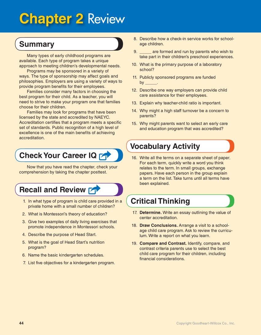 44 Copyright Goodheart-Willcox Co., Inc. Chapter 2 Review Many types of early childhood programs are available. Each type of program takes a unique approach to meeting children’s developmental needs. Programs may be sponsored in a variety of ways. The type of sponsorship may affect goals and philosophies. Employers are using a variety of ways to provide program benefits for their employees. Families consider many factors in choosing the best program for their child. As a teacher, you will need to strive to make your program one that families choose for their children. Families may look for programs that have been licensed by the state and accredited by NAEYC. Accreditation certifies that a program meets a specific set of standards. Public recognition of a high level of excellence is one of the main benefits of achieving accreditation. Now that you have read the chapter, check your comprehension by taking the chapter posttest. 1. In what type of program is child care provided in a private home with a small number of children? 2. What is Montessori’s theory of education? 3. Give two examples of daily living exercises that promote independence in Montessori schools. 4. Describe the purpose of Head Start. 5. What is the goal of Head Start’s nutrition program? 6. Name the basic kindergarten schedules. 7. List five objectives for a kindergarten program. Summary Check Your Career IQ Recall and Review 8. Describe how a check-in service works for school- age children. 9. _____ are formed and run by parents who wish to take part in their children’s preschool experiences. 10. What is the primary purpose of a laboratory school? 11. Publicly sponsored programs are funded by _____. 12. Describe one way employers can provide child care assistance for their employees. 13. Explain why teacher-child ratio is important. 14. Why might a high staff turnover be a concern to parents? 15. Why might parents want to select an early care and education program that was accredited? 16. Write all the terms on a separate sheet of paper. For each term, quickly write a word you think relates to the term. In small groups, exchange papers. Have each person in the group explain a term on the list. Take turns until all terms have been explained. 17. Determine. Write an essay outlining the value of center accreditation. 18. Draw Conclusions. Arrange a visit to a school- age child care program. Ask to review the curricu- lum. Write a report on what you learn. 19. Compare and Contrast. Identify, compare, and contrast criteria parents use to select the best child care program for their children, including financial considerations. Vocabulary Activity Critical Thinking